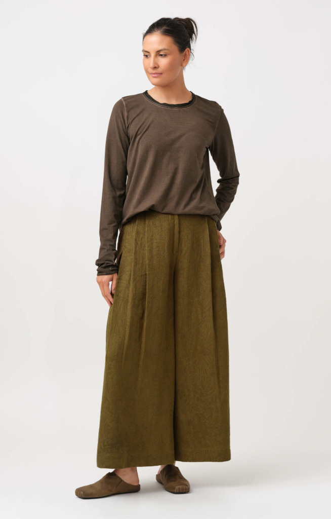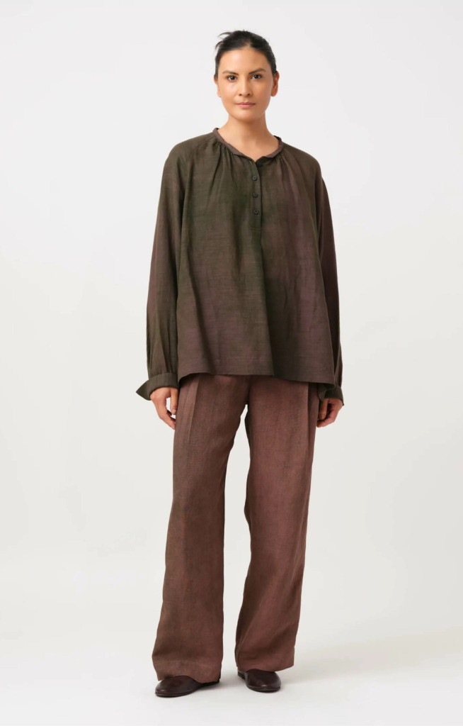 Ziggy champions slow, intentional design—ultimately eschewing seasonal trends to pursue an aesthetic rooted in sensorial memory. The natural fibers of his practice, such as linen, hemp and cotton, are often treated in-studio via dyeing processes such as over-dyeing and piece-dyeing to achieve the label’s signature weathered patina.
