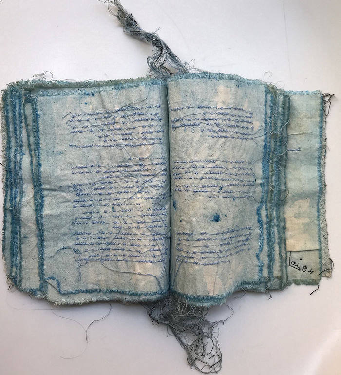 Lai’s most well known for her focus on literature as vital nourishment for the human experience. Her later pieces often mimic the look of open books, inviting a familiarity and curiosity in the audience. There are no defining features other than the lines of text, with words completely illegible and unreadable, adding a layer of intrigue that is difficult to pin down. Often these non-words will spill off the page, as if you could pull a thread and watch the whole book come undone. The threads unspool and knot together, creating an even larger and more mysterious context. There is a sense of comfort in Lai’s work, the familiarity of words and textile, combined with an unease in the bedlam of the knots and the sacrality of finding a forbidden text, foreign and indecipherable.