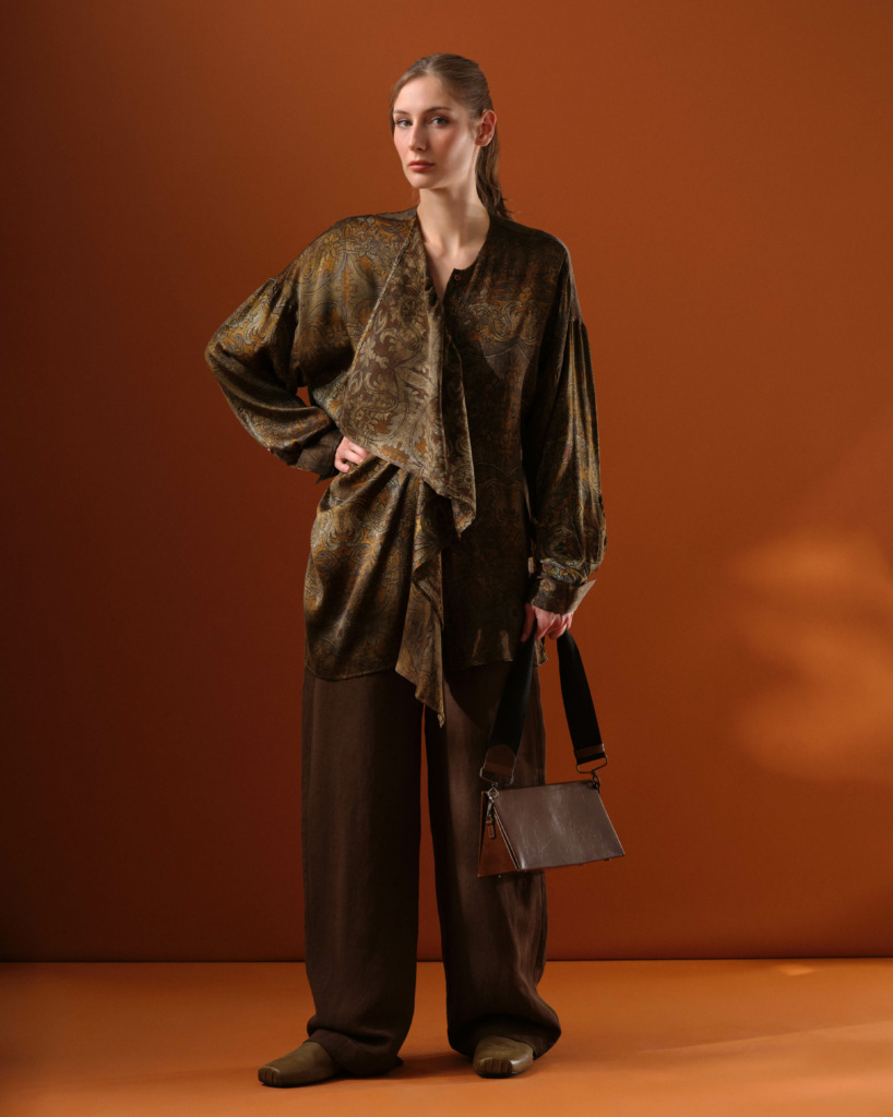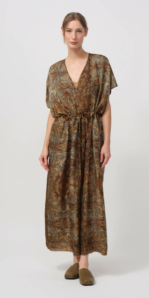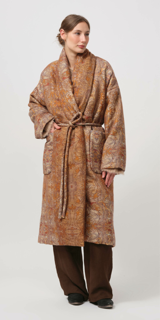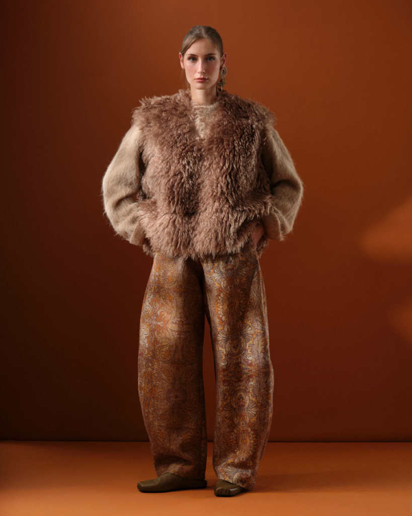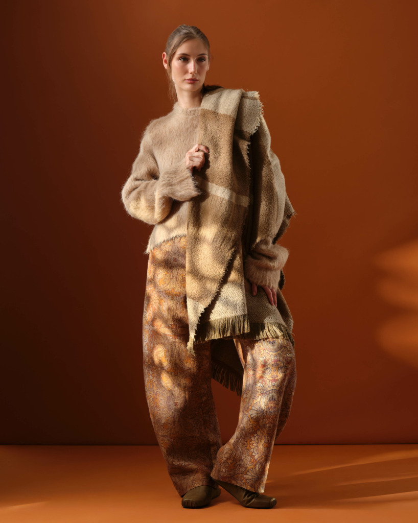 Fun experimentations, such as fuzzy Truss vests and Cinnamon coats, are presented proudly alongside Uma’s classical Acre dresses and Kady jackets. The entire collection is a play on memory, both Uma’s personally and the global consciousness. Vintage and antique silhouettes, such as knit wrap coats and silk peasant tops, are plucked from the past and presented in new light. As is the Uma way, these pieces hold a constellation of interest—beautiful in shape, color and feel.