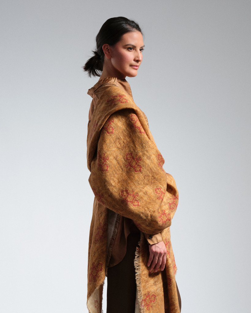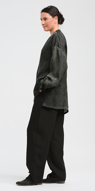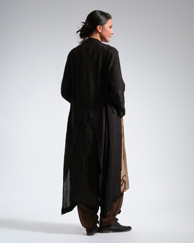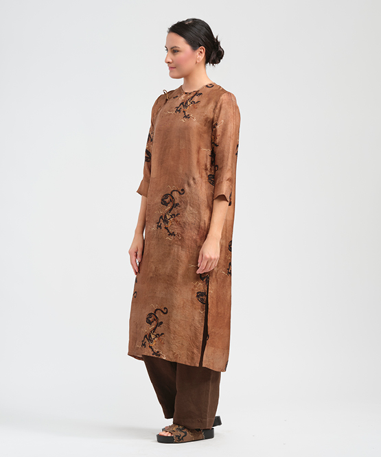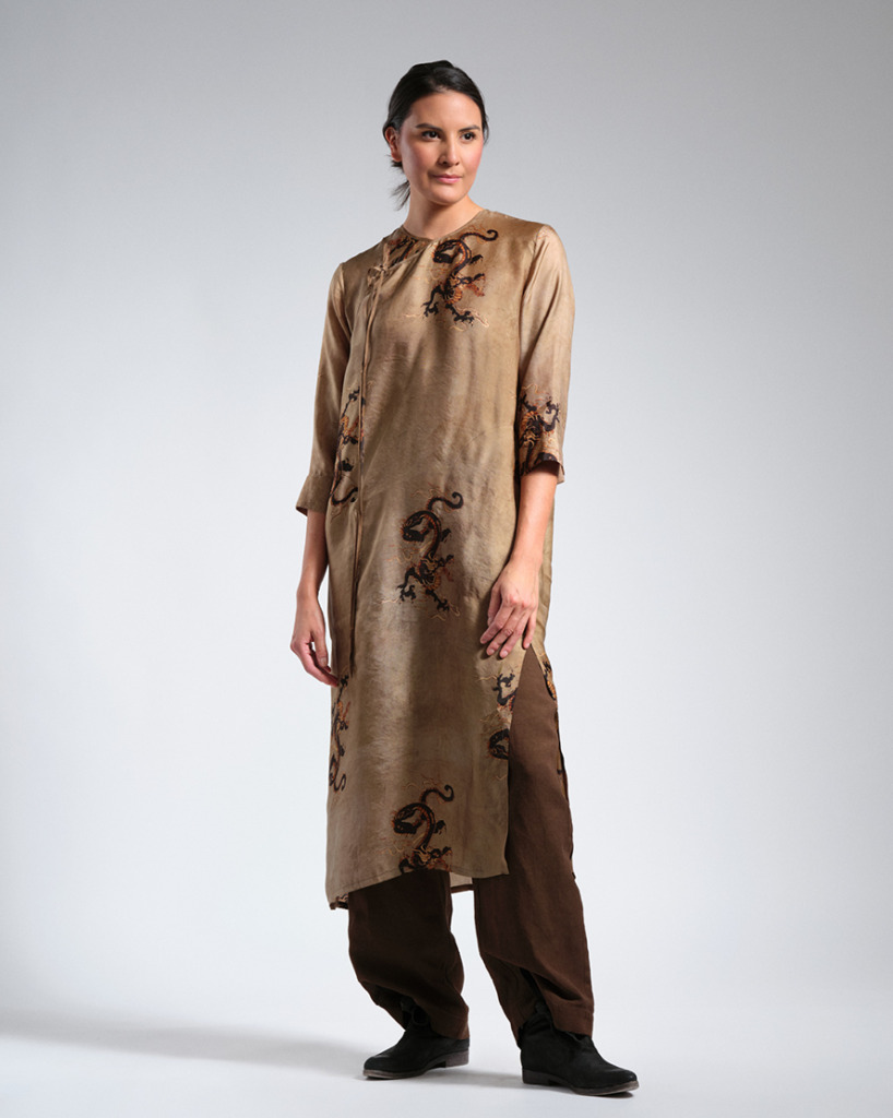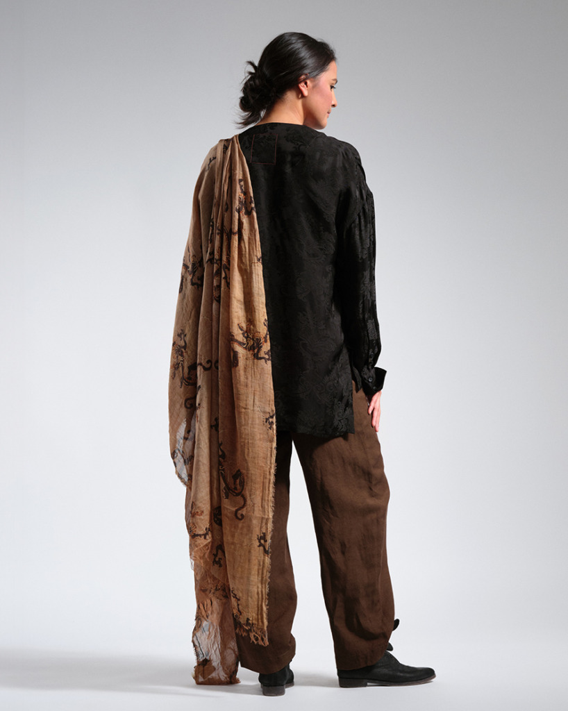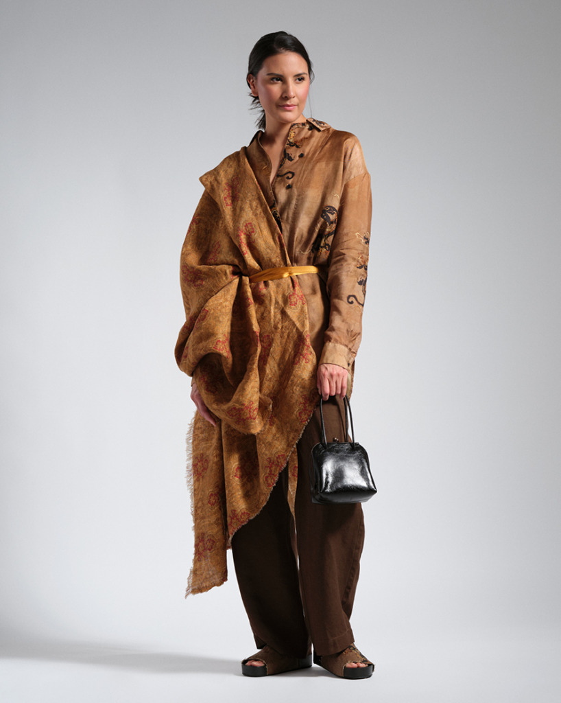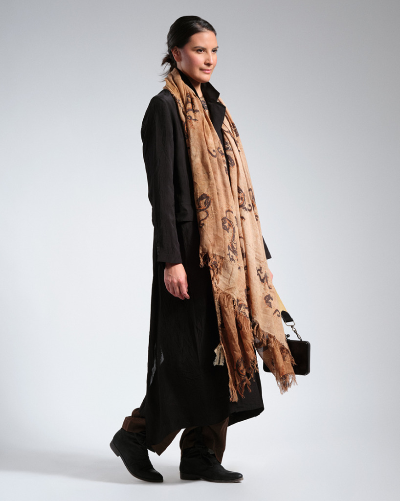 Rendered largely in cotton and vegetable silk, Uma Wang focuses her creative energy on prints and textile in this capsule presentation. The core designs of the collection are pictographic prints that are then cold-dyed over to create a modeled, fresco-like patina. Slender dragons curl across the dresses and shawls, whose fabric was created for Uma Wang by the impeccable House of Lyria studio in Prato, Italy. Several favorite garment styles make a reappearance with this collection, including the Katja jacket, the Tina tee and the Agina dress.