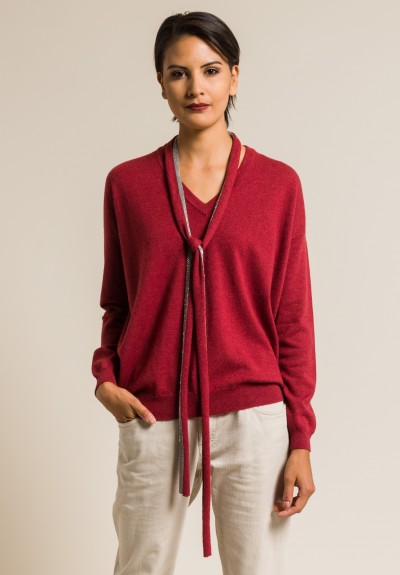Send my friend a link to Brunello Cucinelli Cashmere Paillette Tie V-Neck Sweater in Red