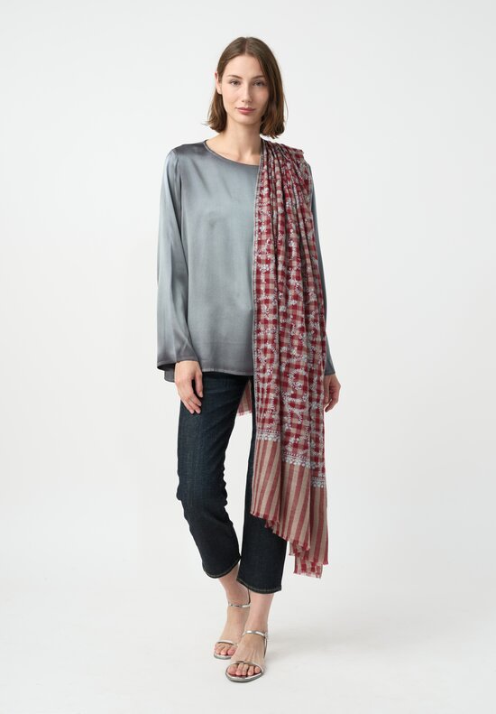 Send my friend a link to Yaser Shaw Cashmere Kashmiri Embroidered Scarf in Red Gingham & Light Blue Vines