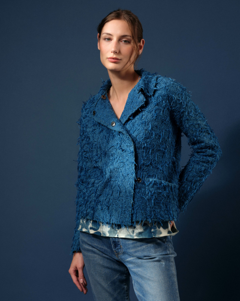 Using a hand knotting technique, this Alabama Chanin double breasted jacket achieves a unique furry texture by embellishing with loose threads.