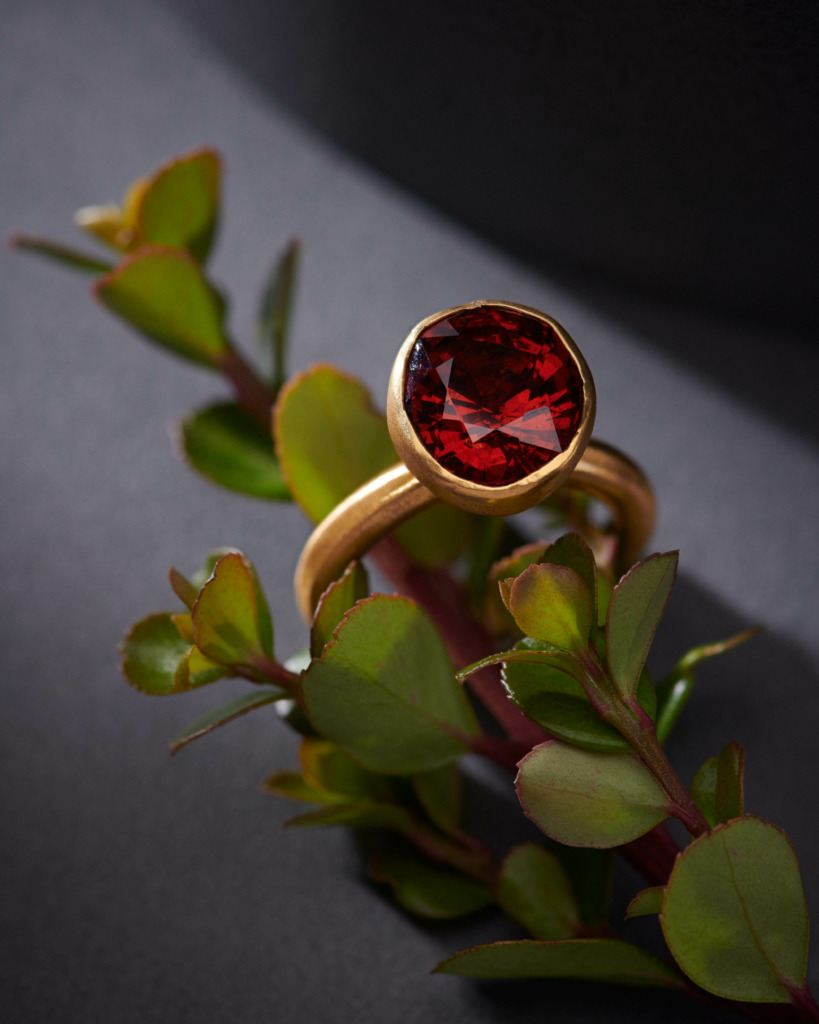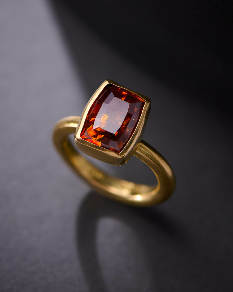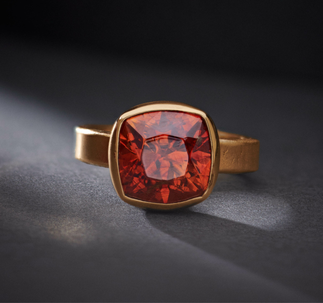 It’s not unusual to see a honeyed spessartite garnet or a crimson sphalerite twinkling within Greig’s workshop. In this, he allows his stones to “speak” – using carefully considered facets and minimal bezels to best show off each gem’s natural character.