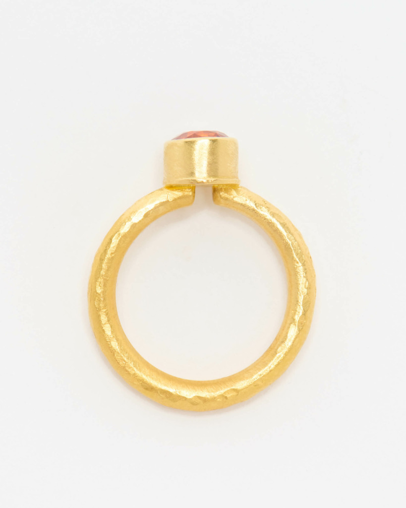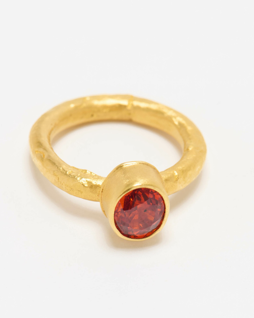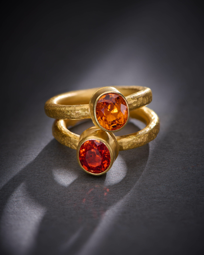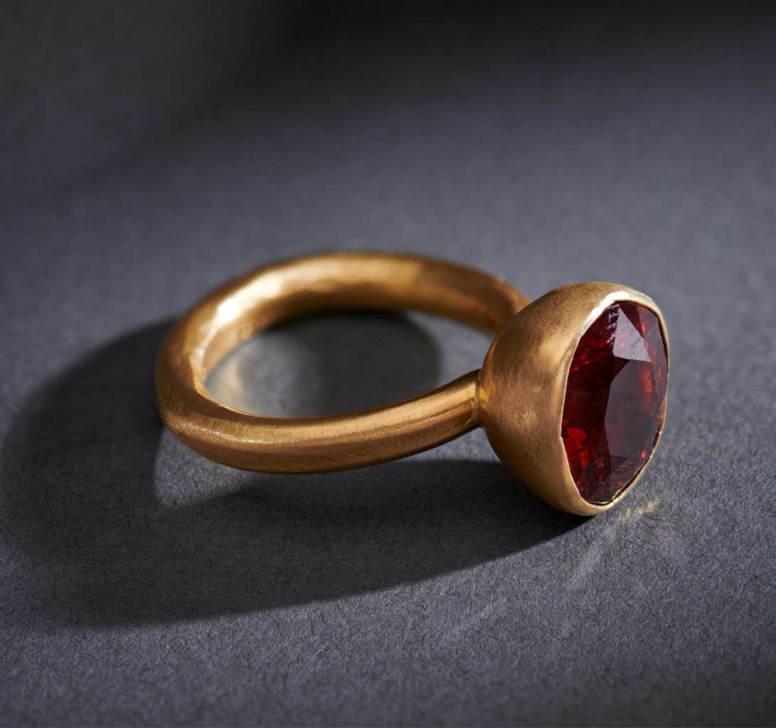 It’s not unusual to see a honeyed spessartite garnet or a crimson sphalerite twinkling within Greig’s workshop. In this, he allows his stones to “speak” – using carefully considered facets and minimal bezels to best show off each gem’s natural character.