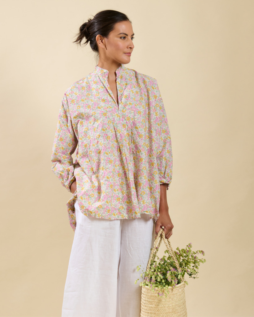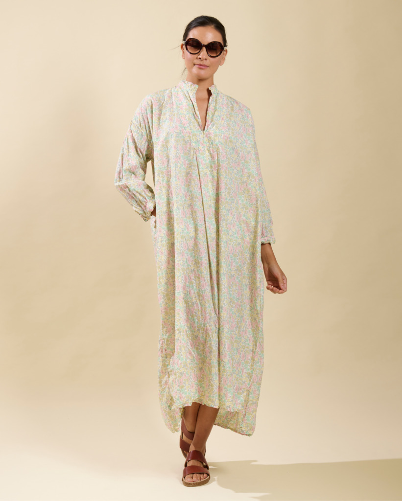 For pre-fall, she explores the depths of Liberty by contrasting pastel fiori prints against elegant, tonal solids.