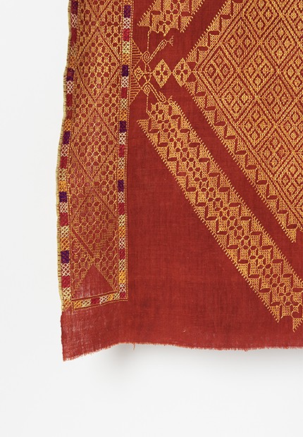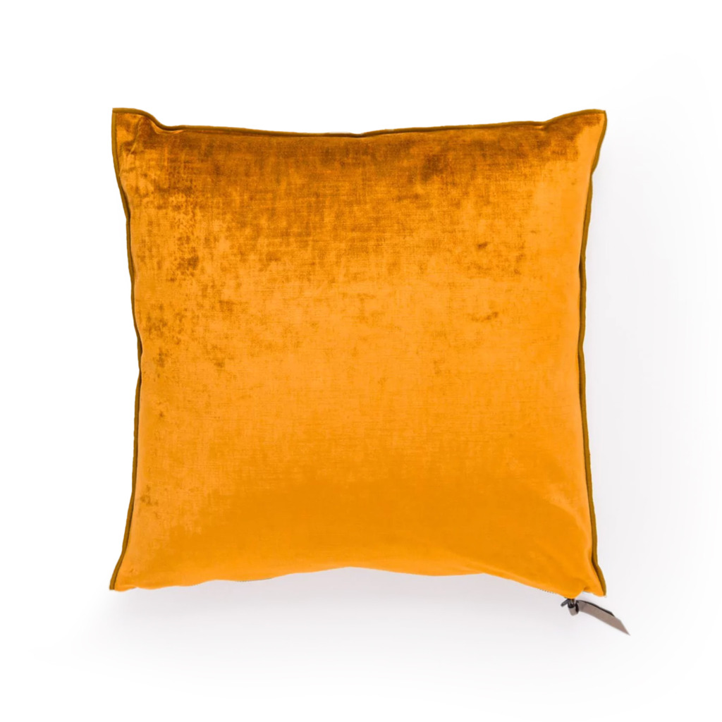 Sitting atop a vintage Danish settee and paired with an antique Indian throw, the soft reds, yellows and oranges of the French-made pillows create a fusion of cultures and eras tied together through a colorful cohesion.