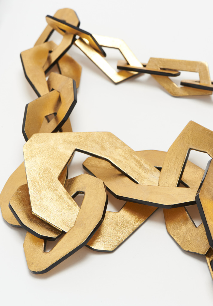 Grand, colorful shapes form Monies’ necklaces, bracelets, and earrings, constructing impressively stunning jewelry that stands out in a flashy but modern style.