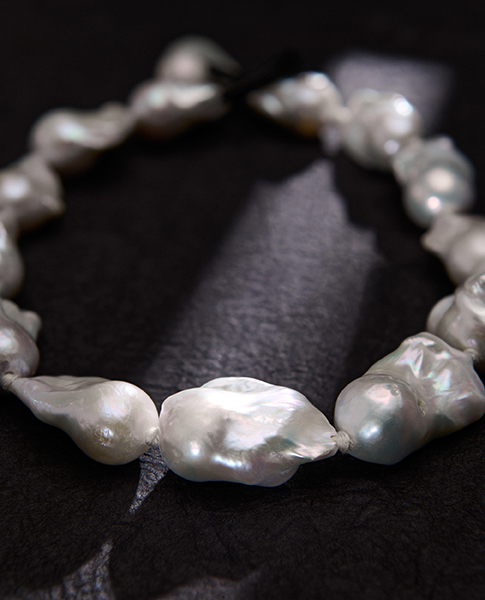 Celebrating the gem’s organic tactility, the Baroque Pearl Necklace evokes the oyster shape of a Willem Claesz Heda still life. Imbued with a sense of intrigue, ebony beadwork is seamlessly strung alongside three large pearls.