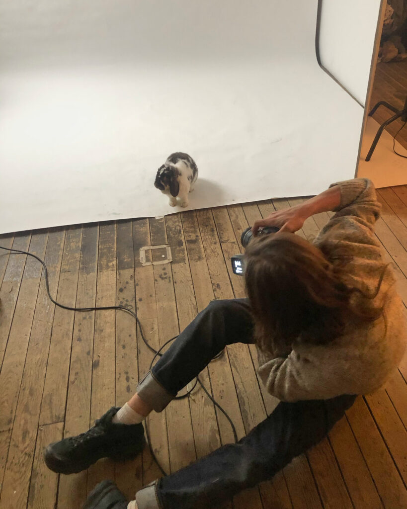 Shooting the rabbits at the studio was a hoot. They came in for work and joined our team in a pen set up under a web office desk. There, they happily crunched their way through several wooden toys between frequent snoozes. Many water bowls were tipped over in their pursuit for hay and attention. The staff took turns offering them their favorite treats: blueberries, cabbage, broccoli & dill. Truly, from 9-2pm our office was distracted by floppy ears, busy noses and hopping cuteness. During our shoot in the basement studio of Wild Life, our photographer, Tim, sprawled across the floor to get the right angle while the two bunnies hopped across the floor trying to get at even more dill! In the end, they were excellent, curious models and we thank them for taking the time to explore the studio and pose for us!