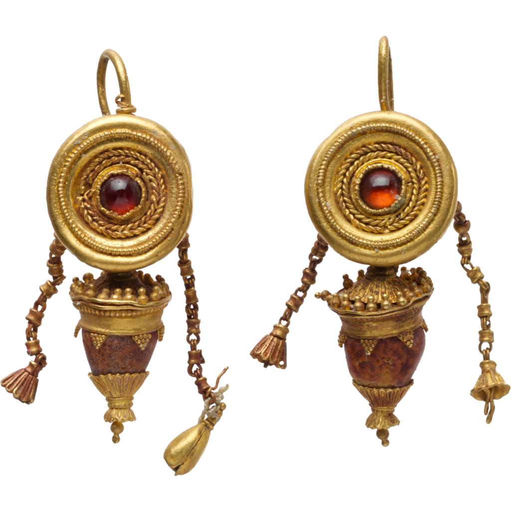 Depictions of earrings, brooches, bracelets, beads and arm cuffs adorn drawings of classically shaped amphoras and other traditional Greek vases, decorating the colorful backgrounds and various fabrics of flattering shirts and dresses.