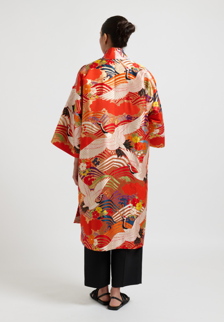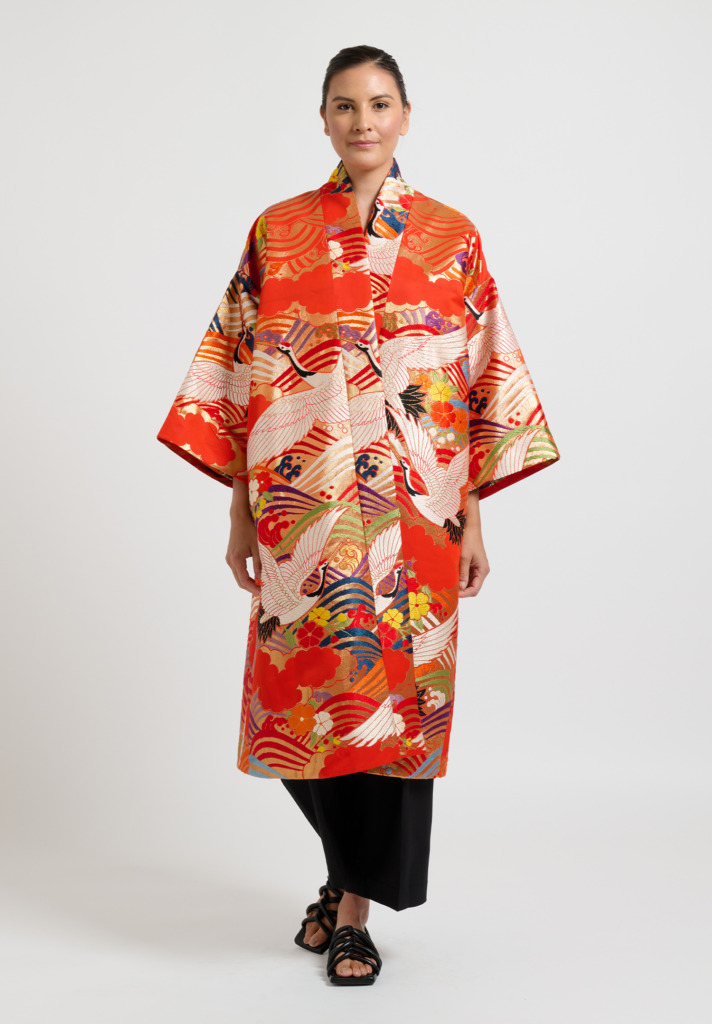 A part of this unique line is a jaw-dropping, brilliantly vibrant and intricately detailed orange kimono decorated in a flying crane motif of East asian origin.