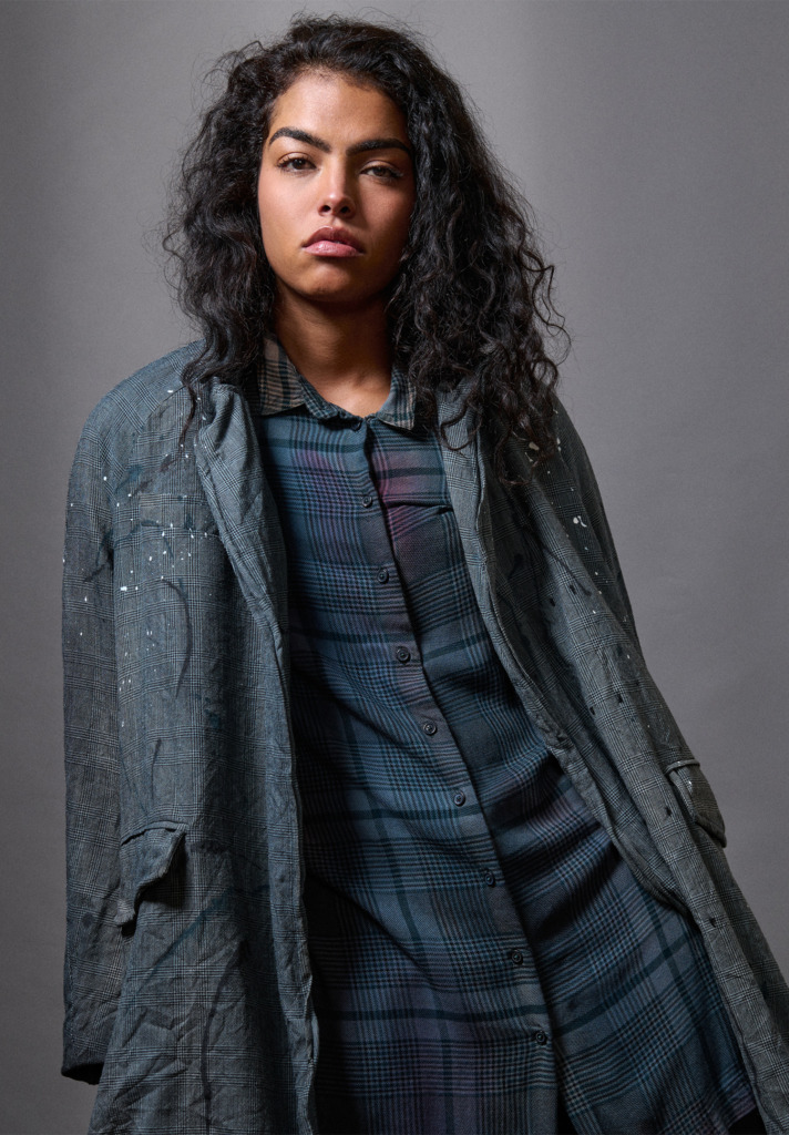 Borrowing from the 1990s grunge look, the houndstooth coat resembles the well-worn school uniform of a British student with its neutral palette of grays and loose, oversized fit.