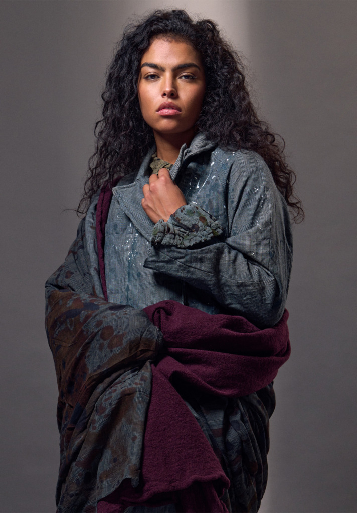 A moldable wire sewn into the collar, placket, hem and pocket flaps of the garment adds a creative touch of complexity, allowing for the bending and shaping of the garment to give it a charismatic, broken-in look.