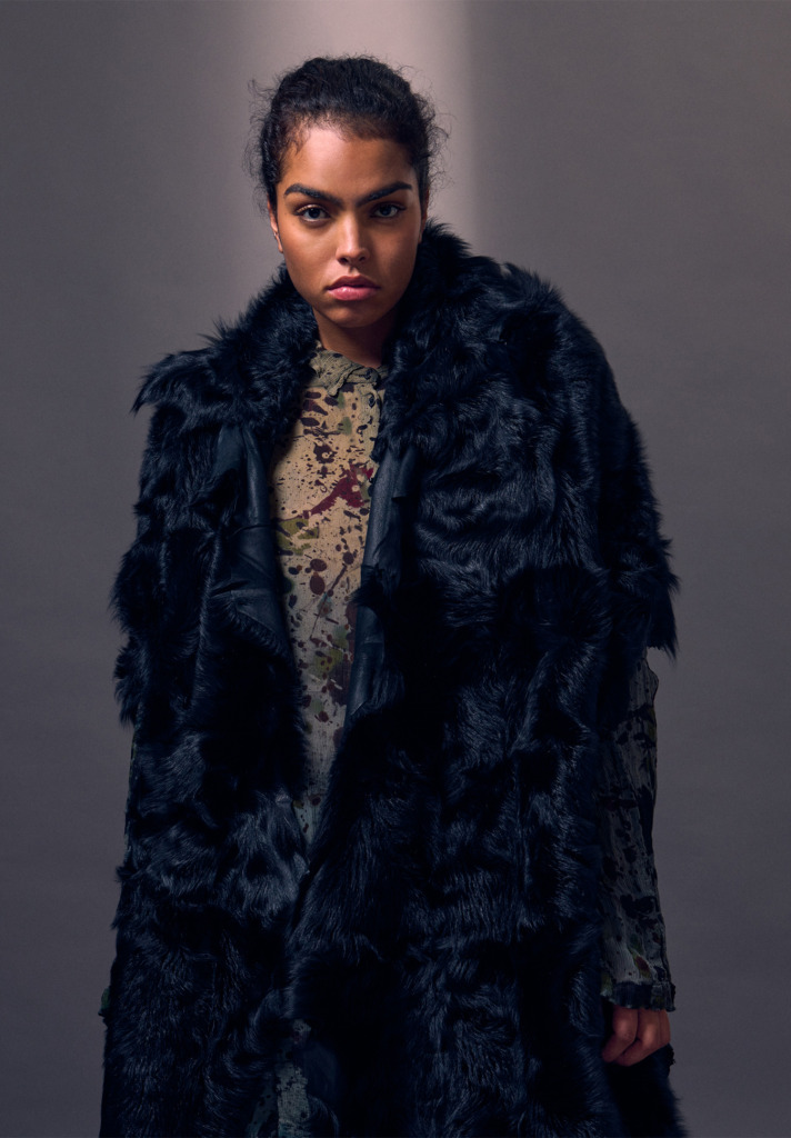 Leaning into the aloof grunge aesthetic, droplets, streaks and smears of paint mark the coat with the casual demeanor of an expressionist’s paint flowing from one brushstroke to the next.