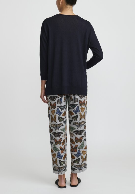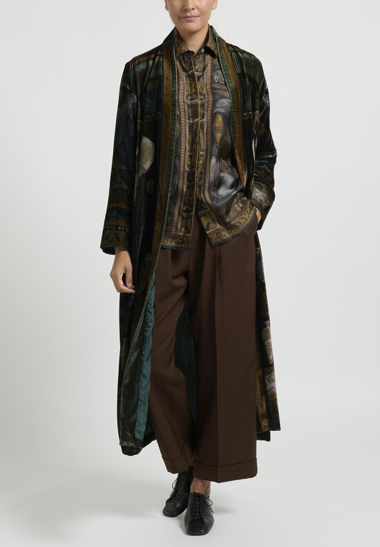 Shades of blues, greens, reds, golds and grays paint her silk and velvet scarves, tops and jackets, creating a dark and moody atmosphere for these ancient stories.