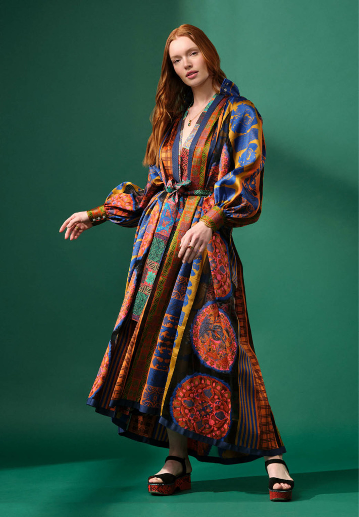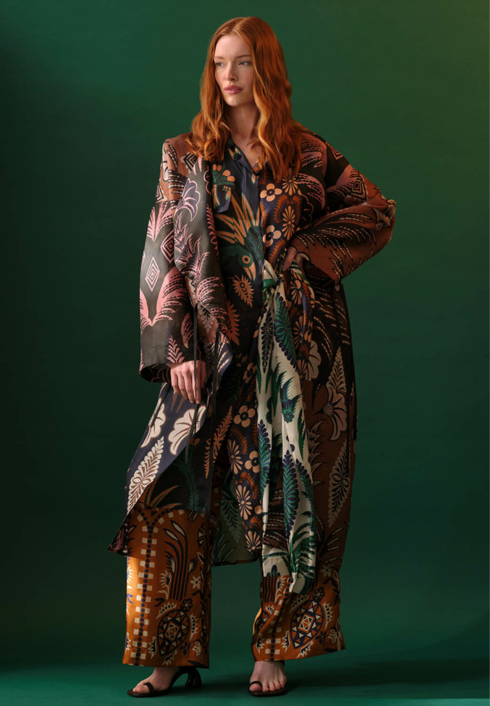 The team at Dries revives an intricate floral print from the archives–rendered in the tangy, jewel-tones we crave for summer. In classic Dries Van Noten style, silver embellishments, such as snap buttons and hanging beads, are layered on top adding an edge of industrial cool.
