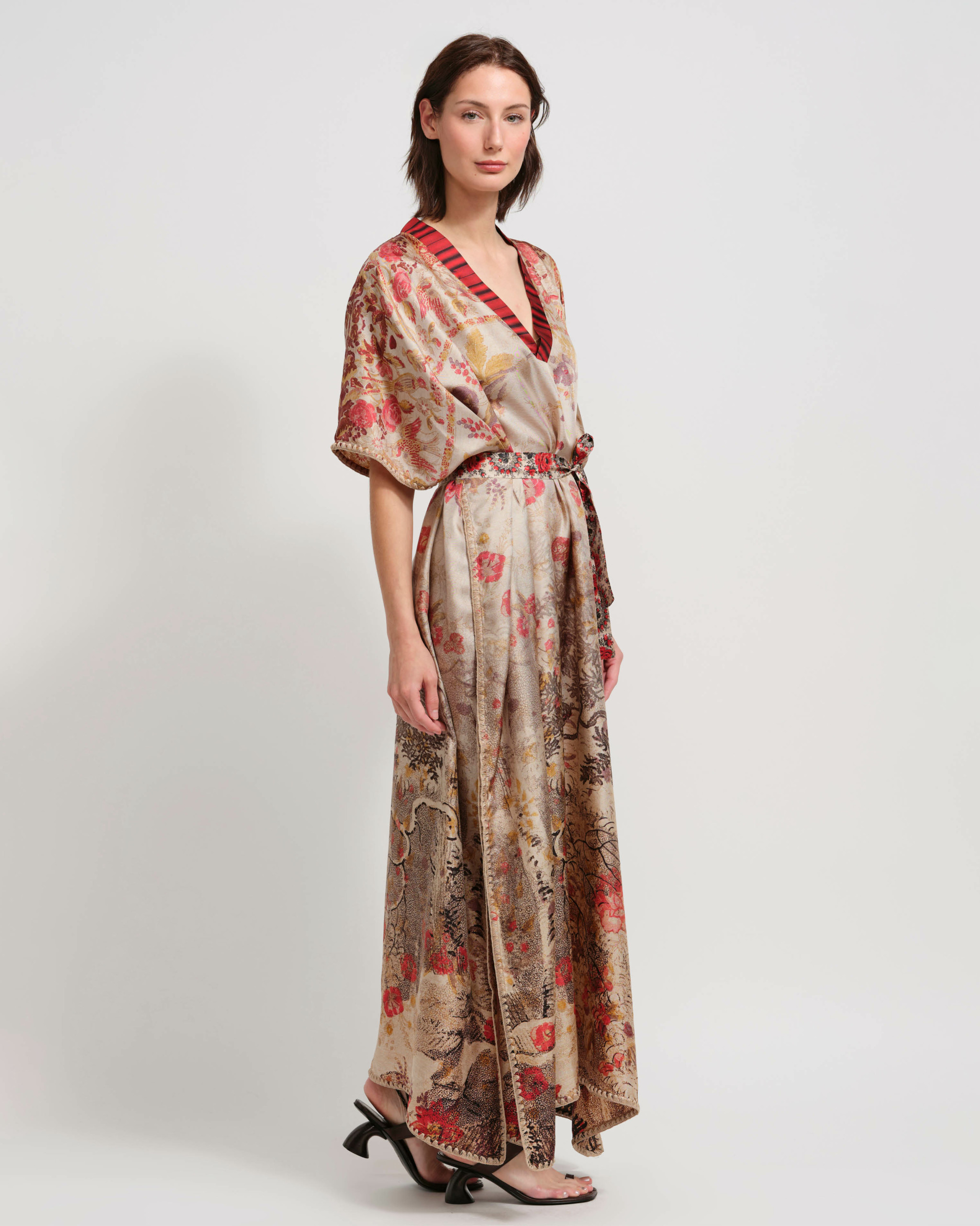 Model wearing Pierre Louis Mascia Silk Aloe Dress in Ink Wash Painting, Artistic print fashion made in Italy
