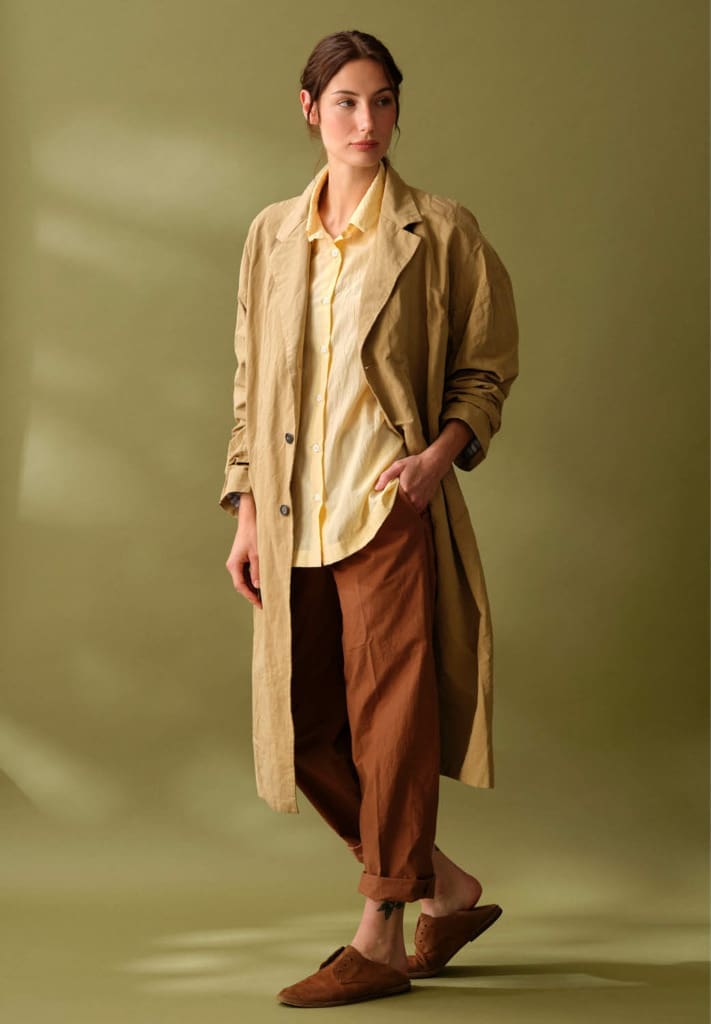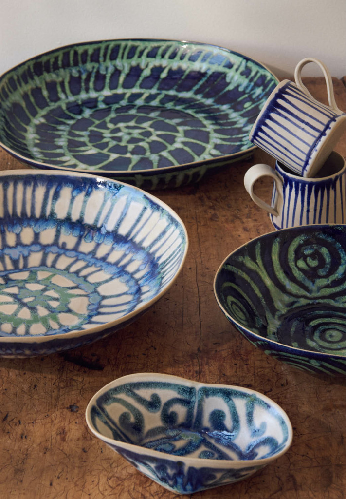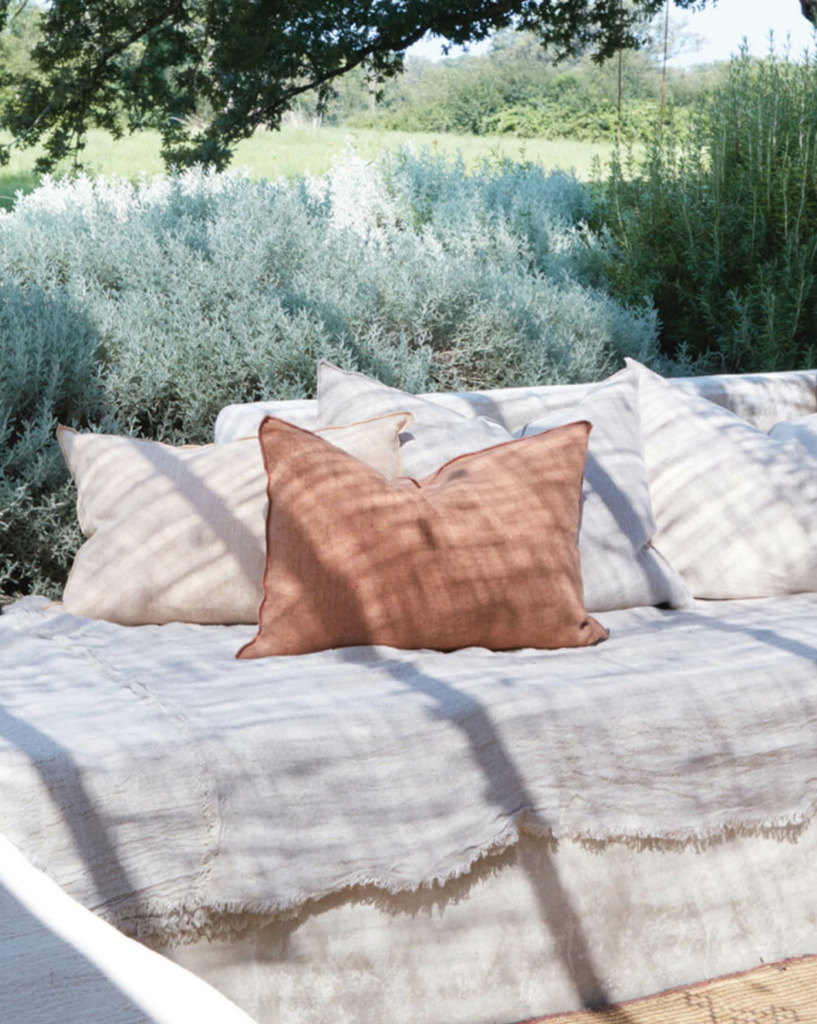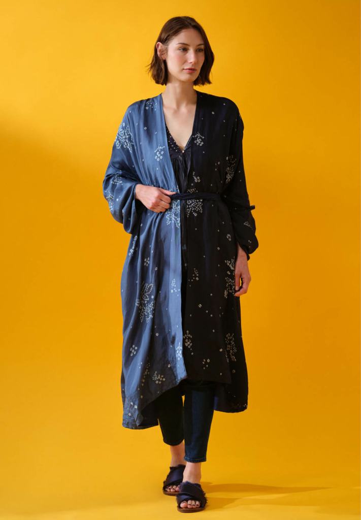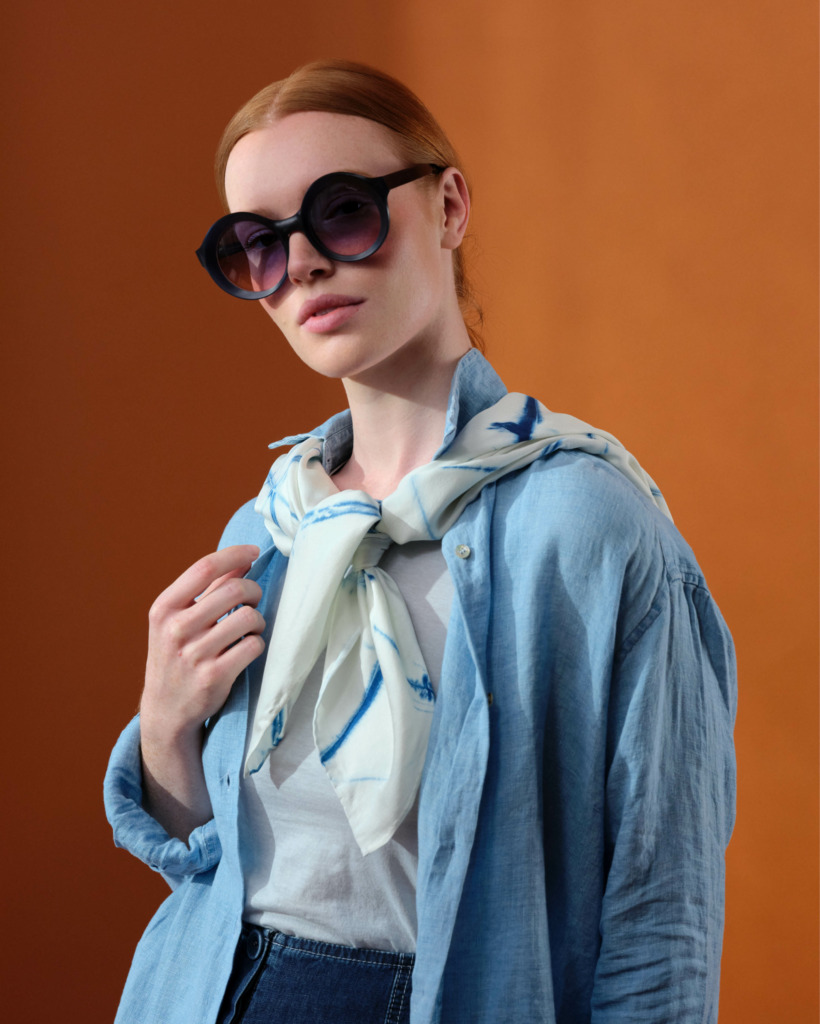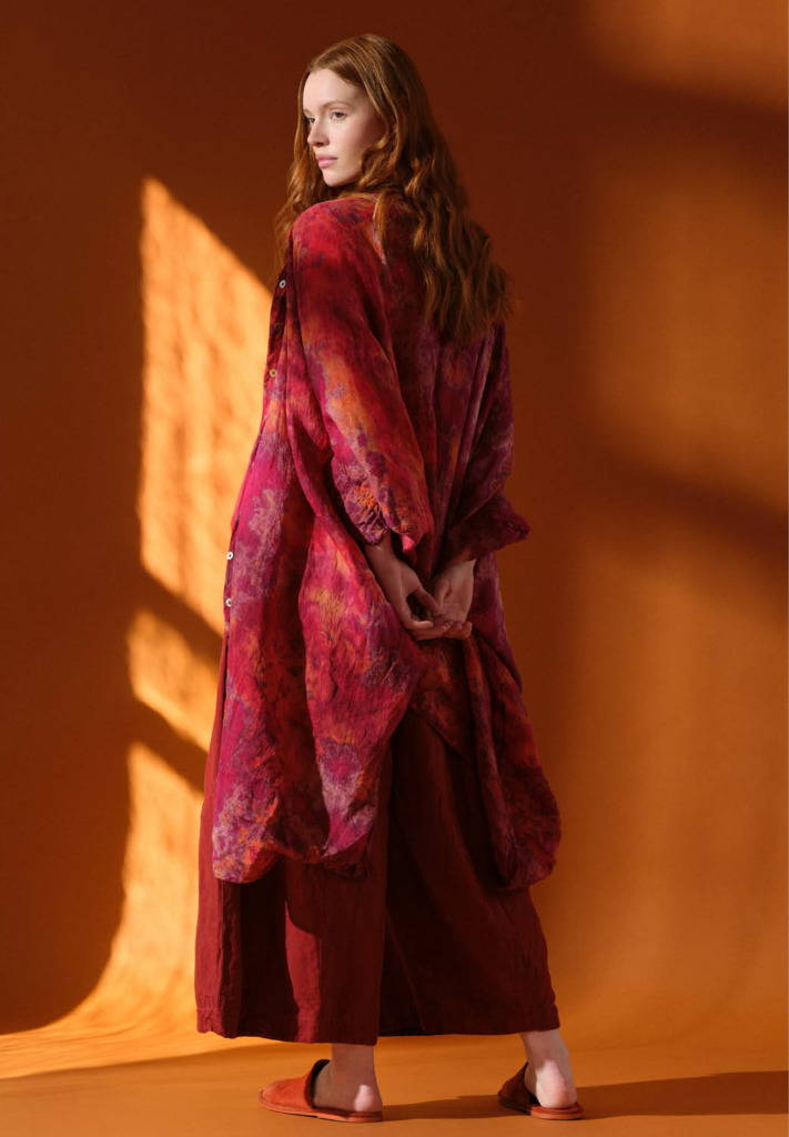 In her signature flowing silhouettes, Gilda explores the punchy intersection of rust and cerulean. Whether traveling, beaching or gardening, her hand-dyed textiles take the day in stride.