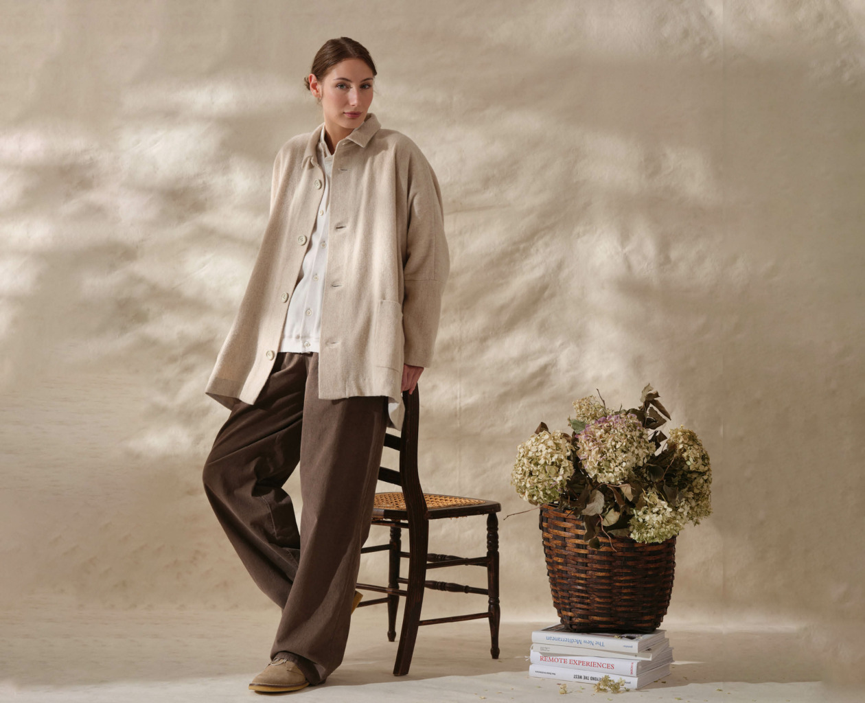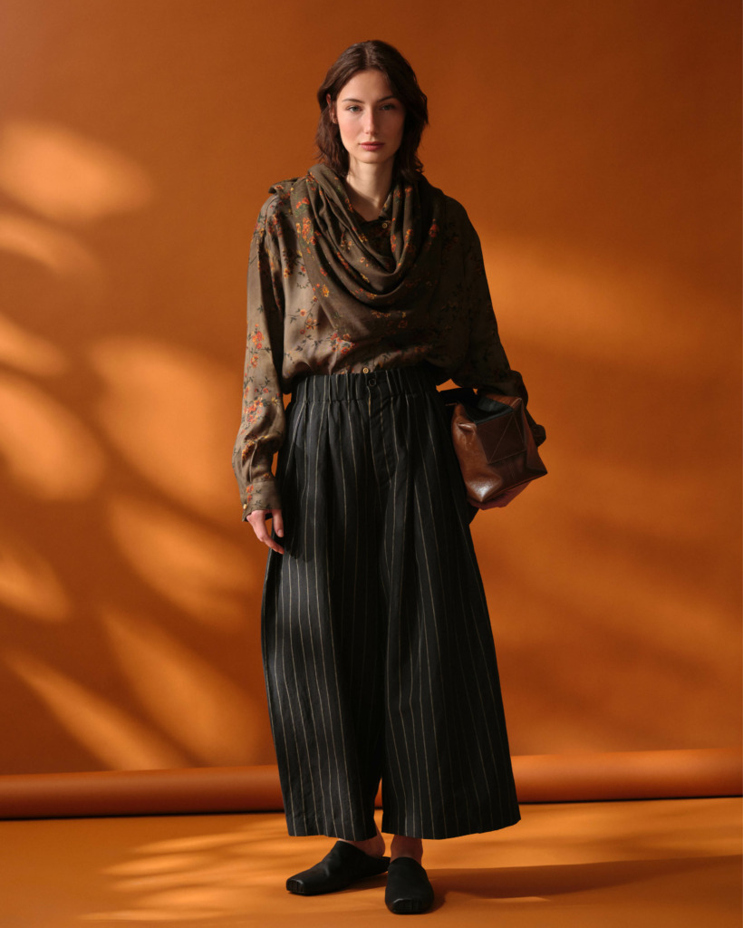 In the heady prints of Uma Wang’s Pre-Spring, we find not the romance of the garden, but the subtle drama. The delivery evokes the first buds peeking through damp earth, a signal of the world starting anew. Subtle textures in olive and brown dominate the collection in tones that Uma refers to as artichoke, cocoa and hazel.