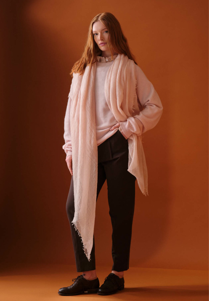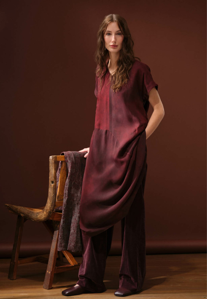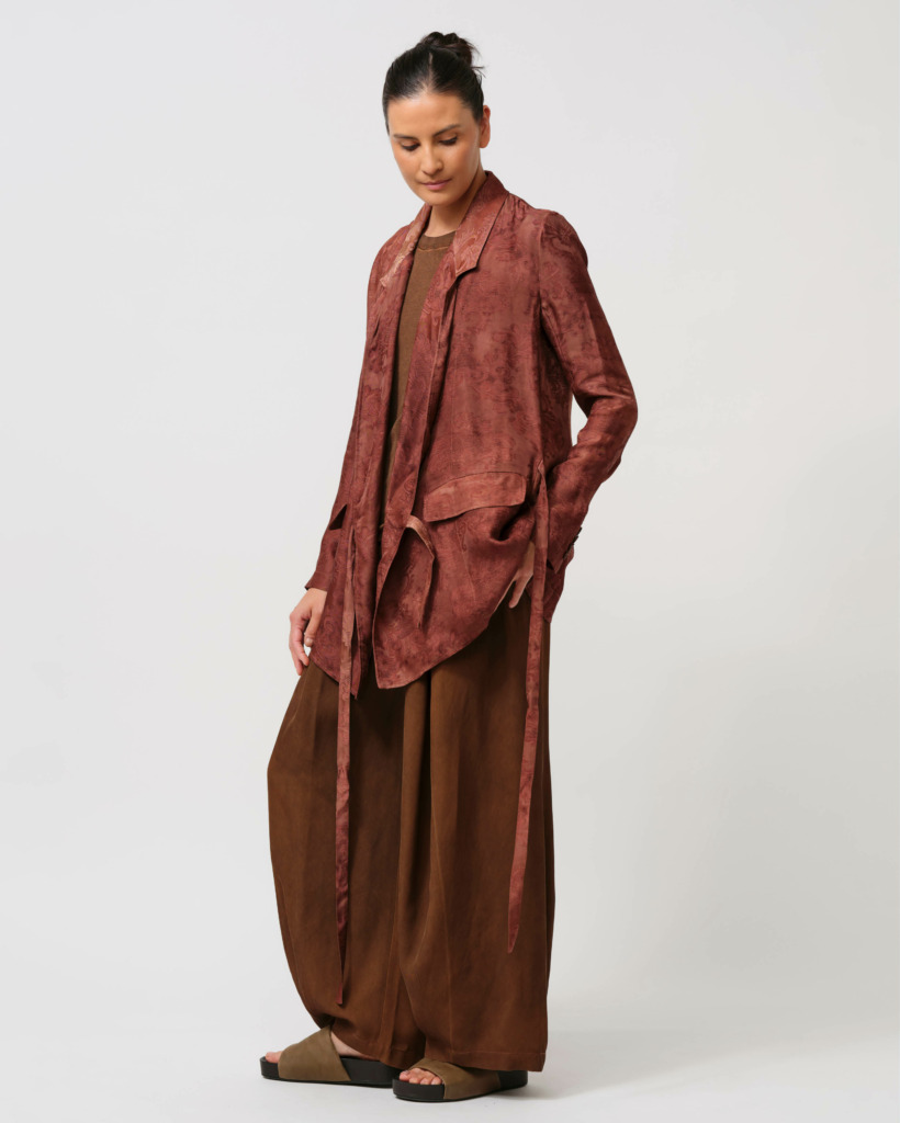This earthy, provocative collection proves pattern does not have to be bright to be striking. Using atmospheric effect to her advantage, Uma Wang explores delicate brocades and subtle iridescent finishes that shift depending on the light.
