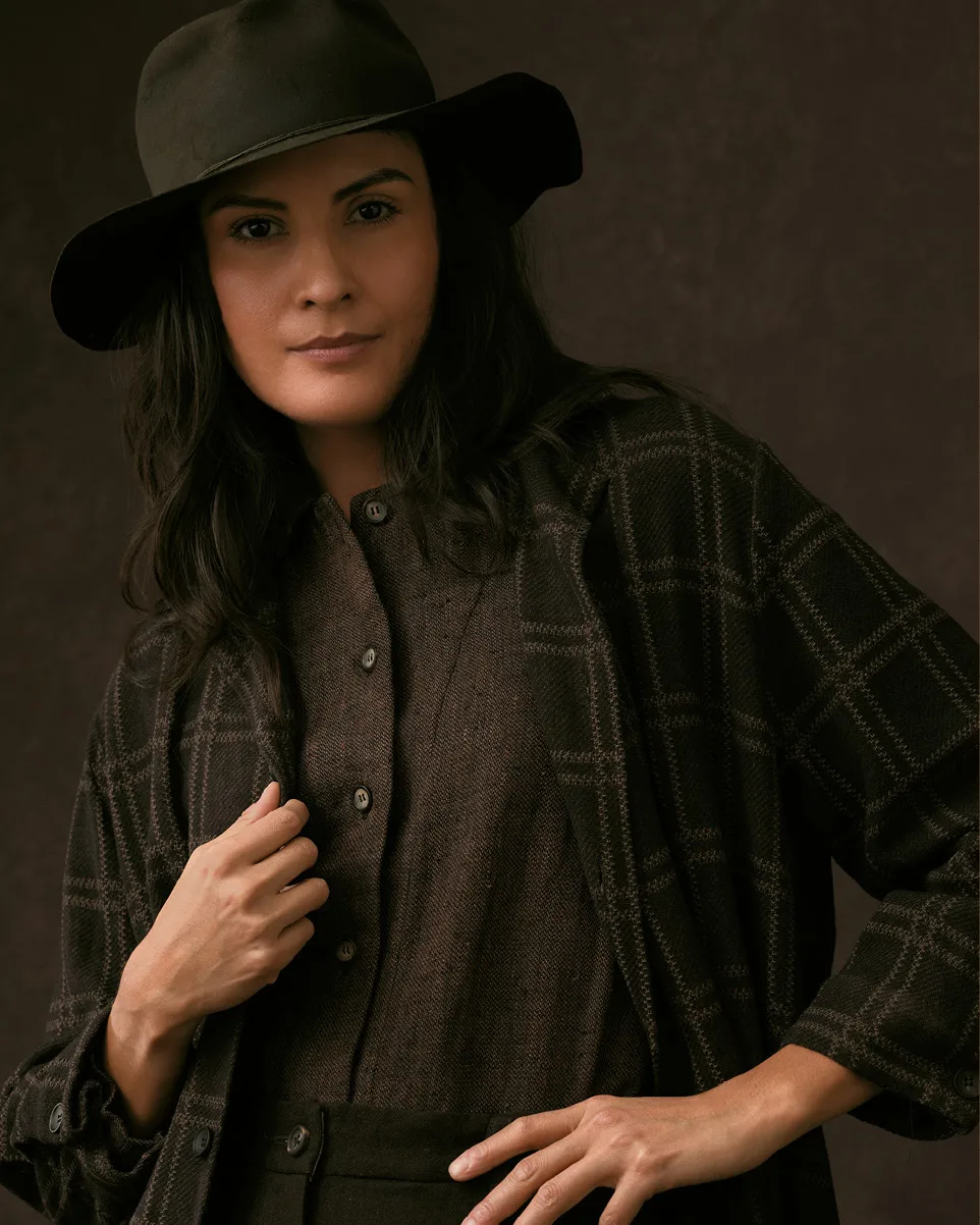 Crafted in her flower-bulb-shed-turned-atelier outside Amsterdam, the line features raw silk, linen, and wool with double weaves that combine durability with unexpected softness. Tightly woven fibers create a tactile surface, while a palette of brown-toned reds, plums, and grays (sometimes worked into subtle plaids) evokes the muted beauty of wintertime. The garments carry a sense of suspended time, evoking nostalgia while remaining entirely contemporary.