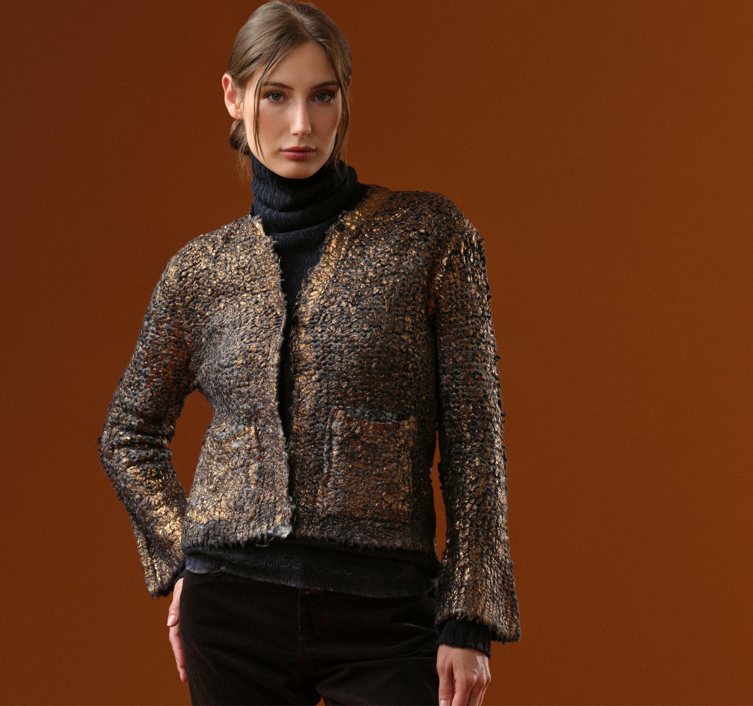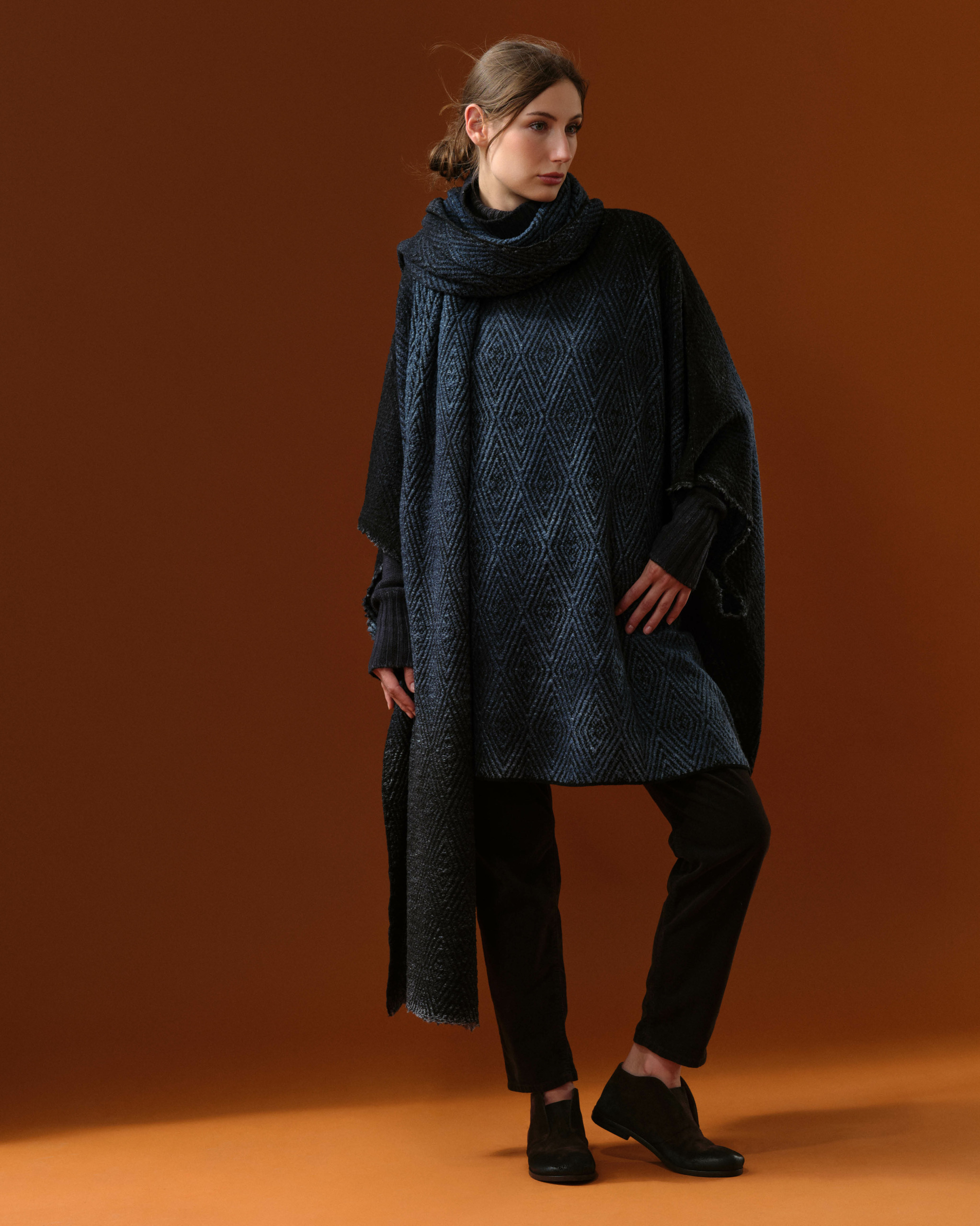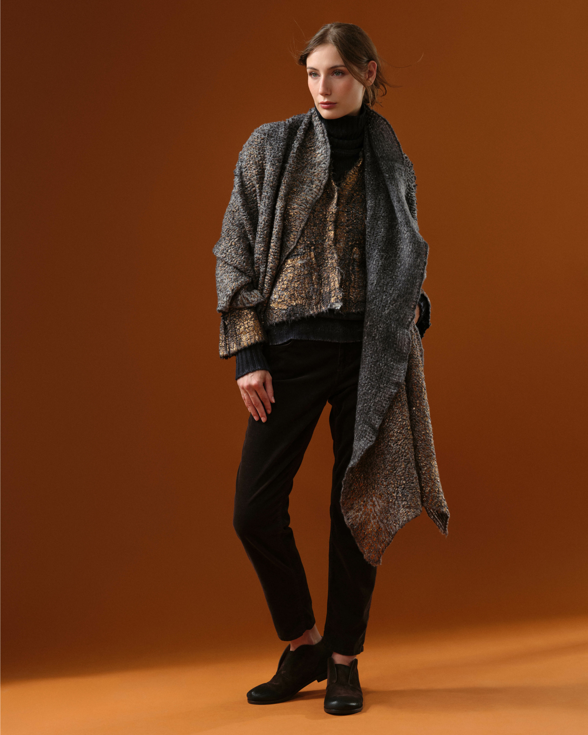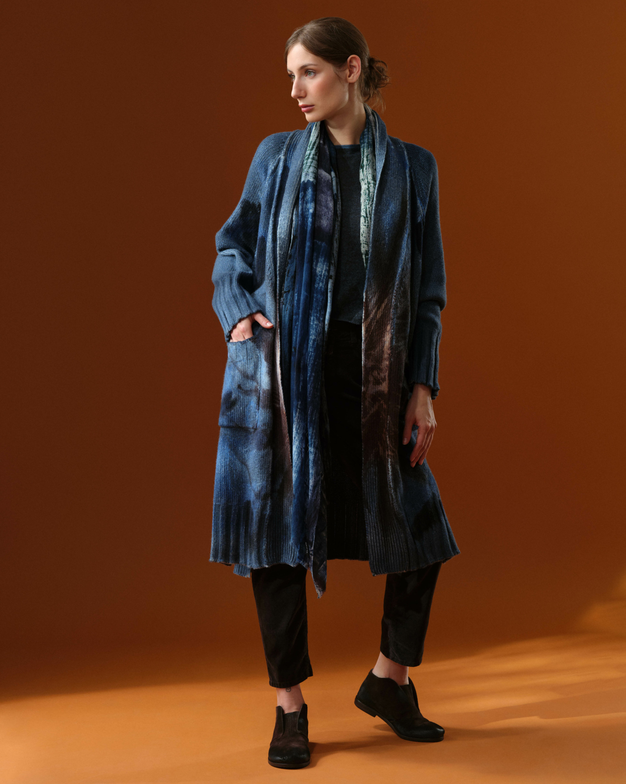 This capsule collection is defined by a contrast of indigo and copper. Find a painterly approach across this small selection, including the Diamante jacquard knits, the Savana painted scarves, and an offering of artful, longline cardigans made from recycled cashmere.