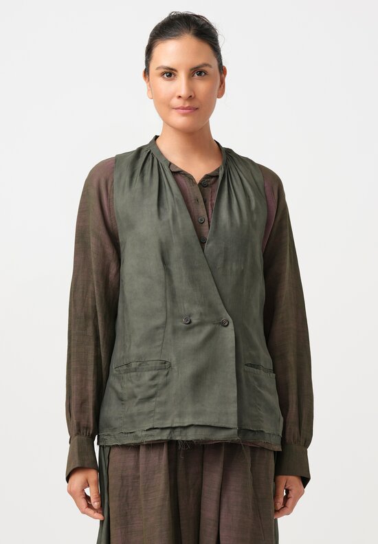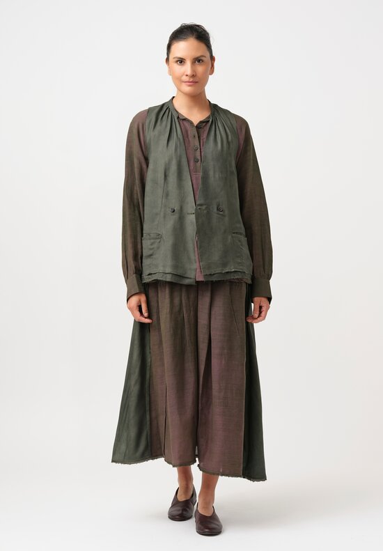 Silk & Linen Drawstring Blouson Button-Down Shirt in Plum Brown