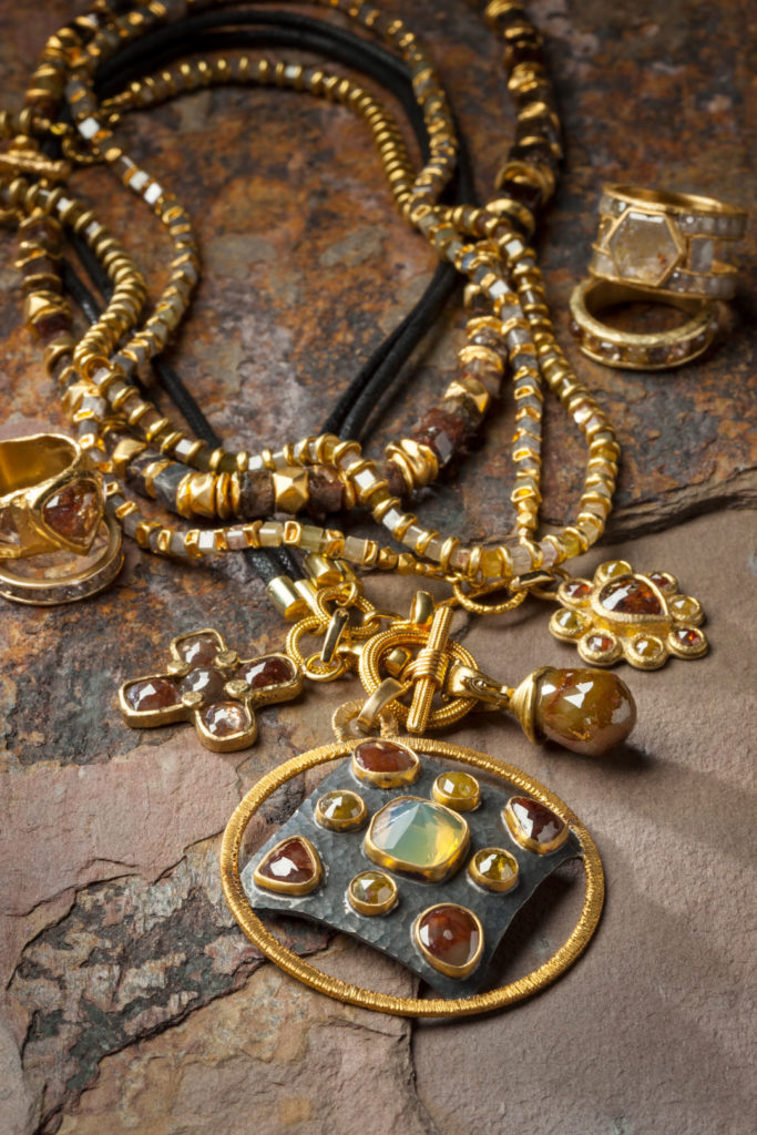 Join us in welcoming Santa Fe artist, Karen Melfi, to Santa Fe Dry Goods. Karen specializes in naturally colored diamonds that are polished, cubed, faceted and set with 18 and 22K gold. Her dynamic artistry is greatly inspired by the elegant lines of Japanese design and artifacts from around the world – Tibet, China and North Africa. These various elements are combined to create a handcrafted opulence that can be worn daily.