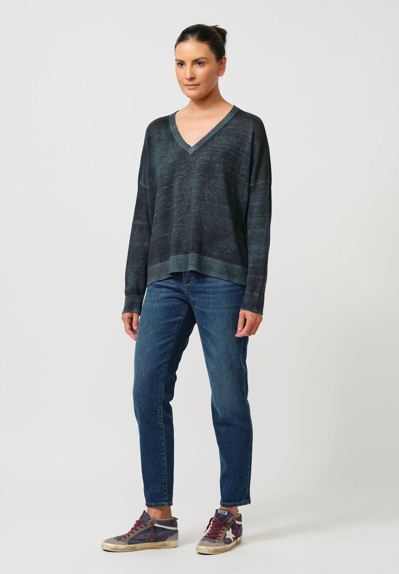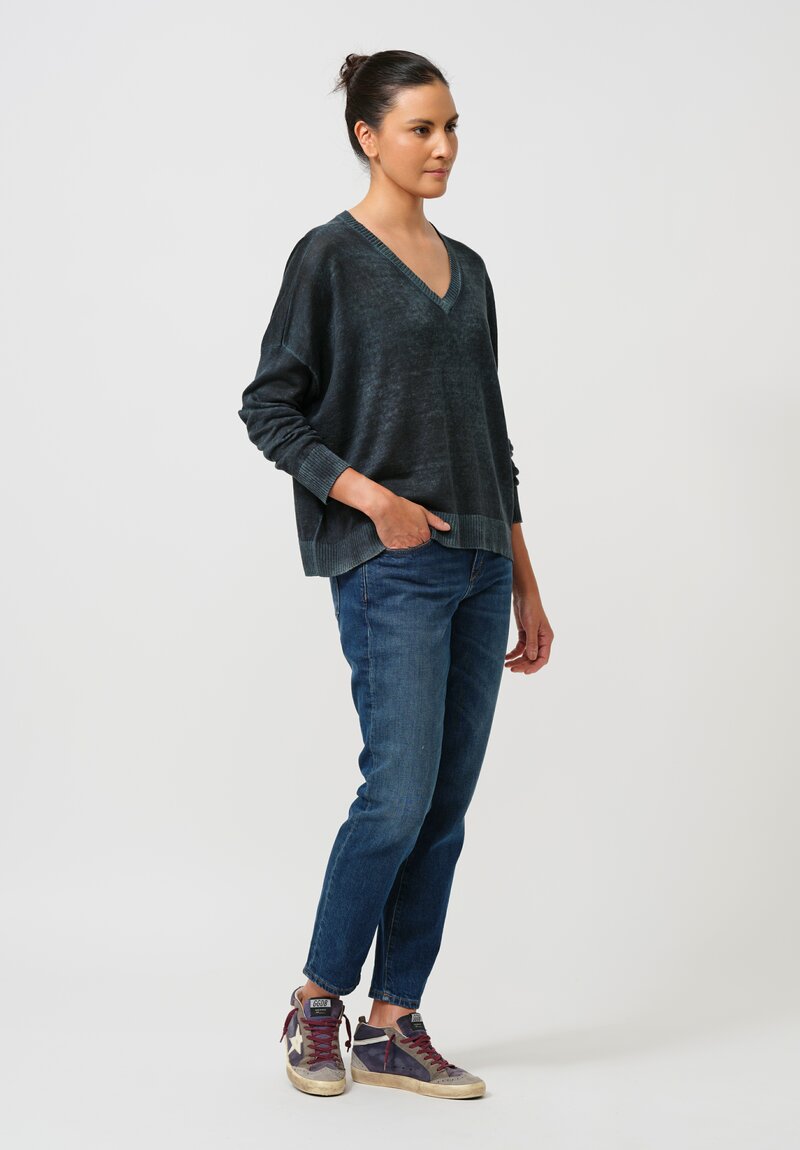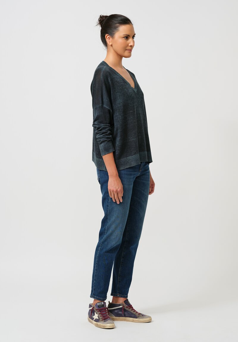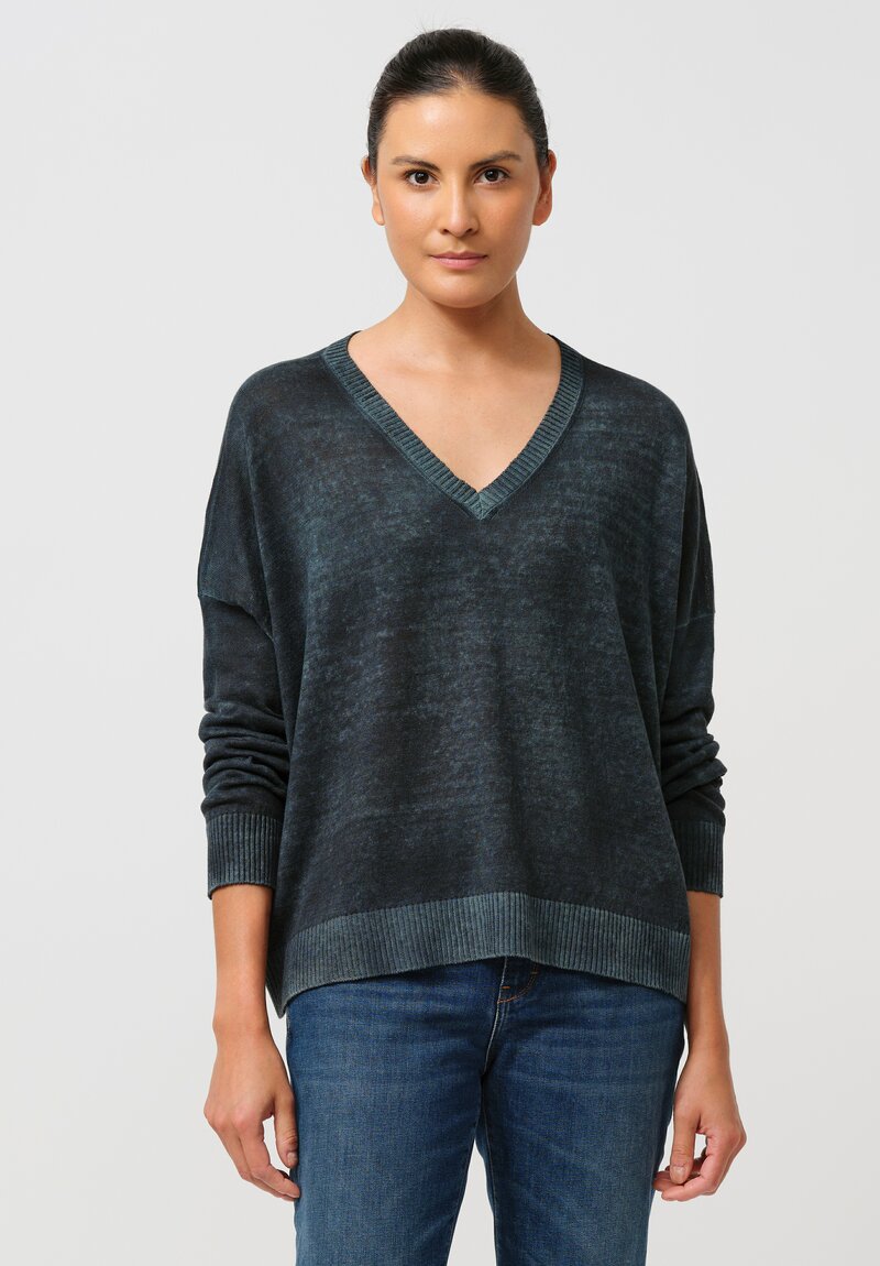 Linen & Cotton Ribbed Hem V-Neck Sweater in Nero & Forest Green