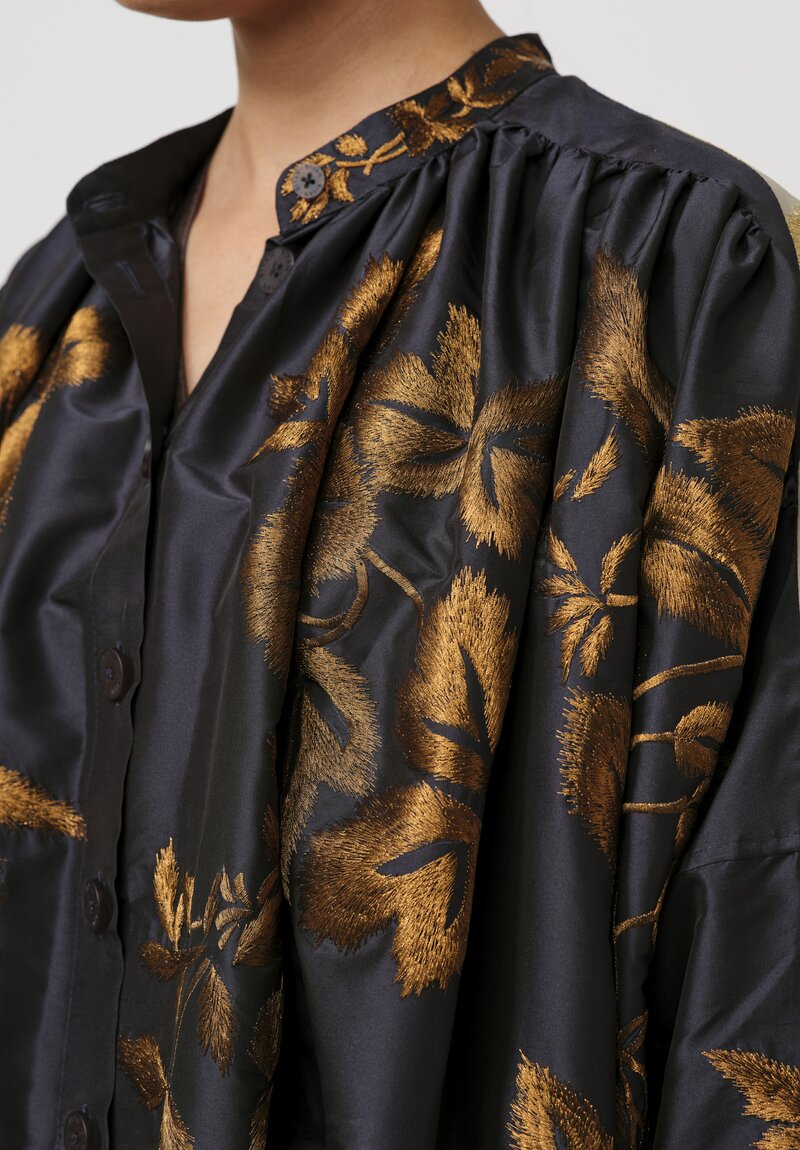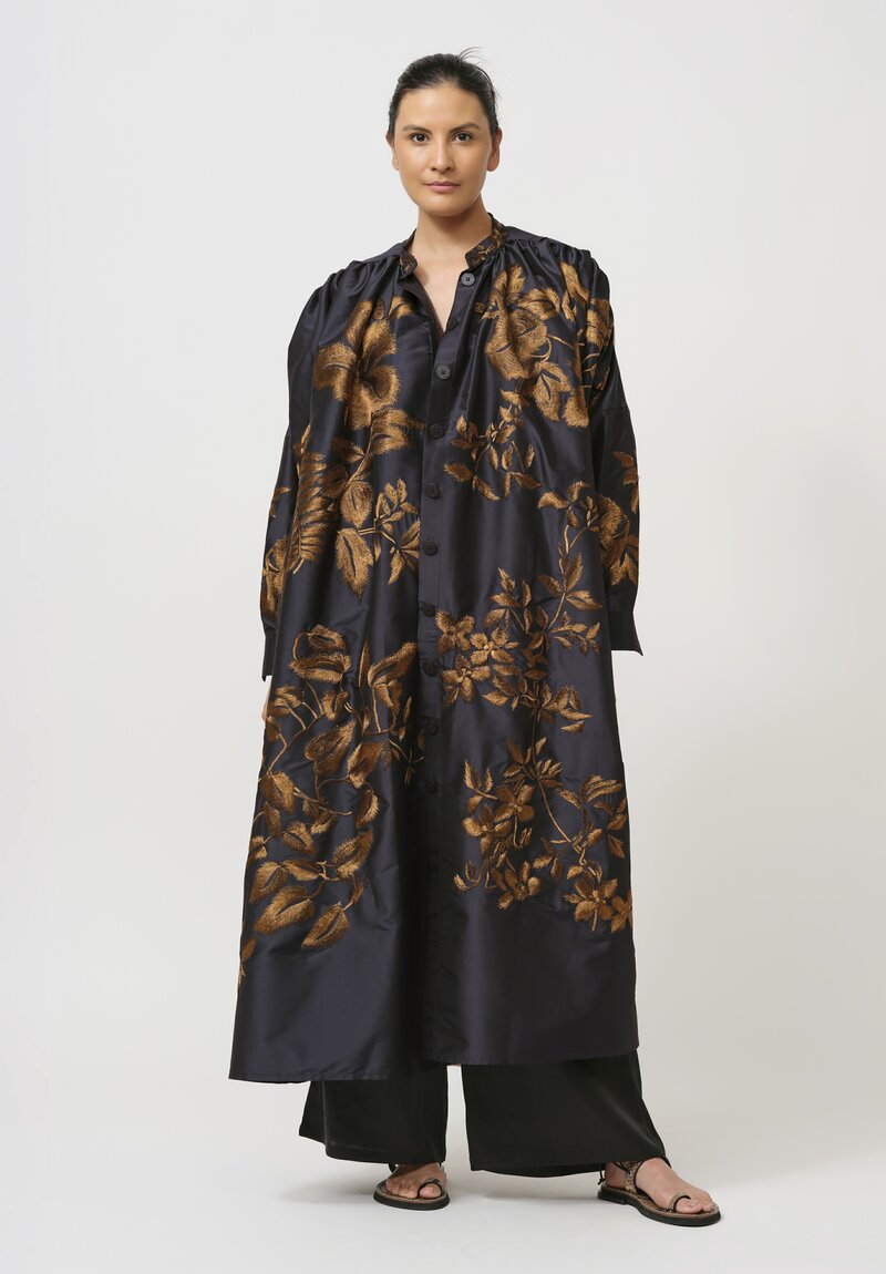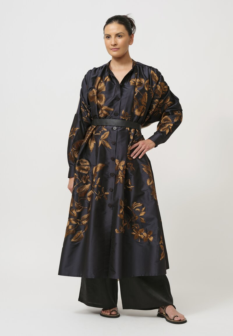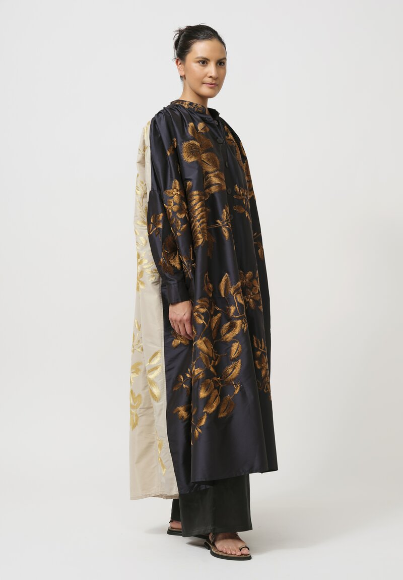 Leaf Embroidered Taffeta Coat Dress in Navy Blue & Cream