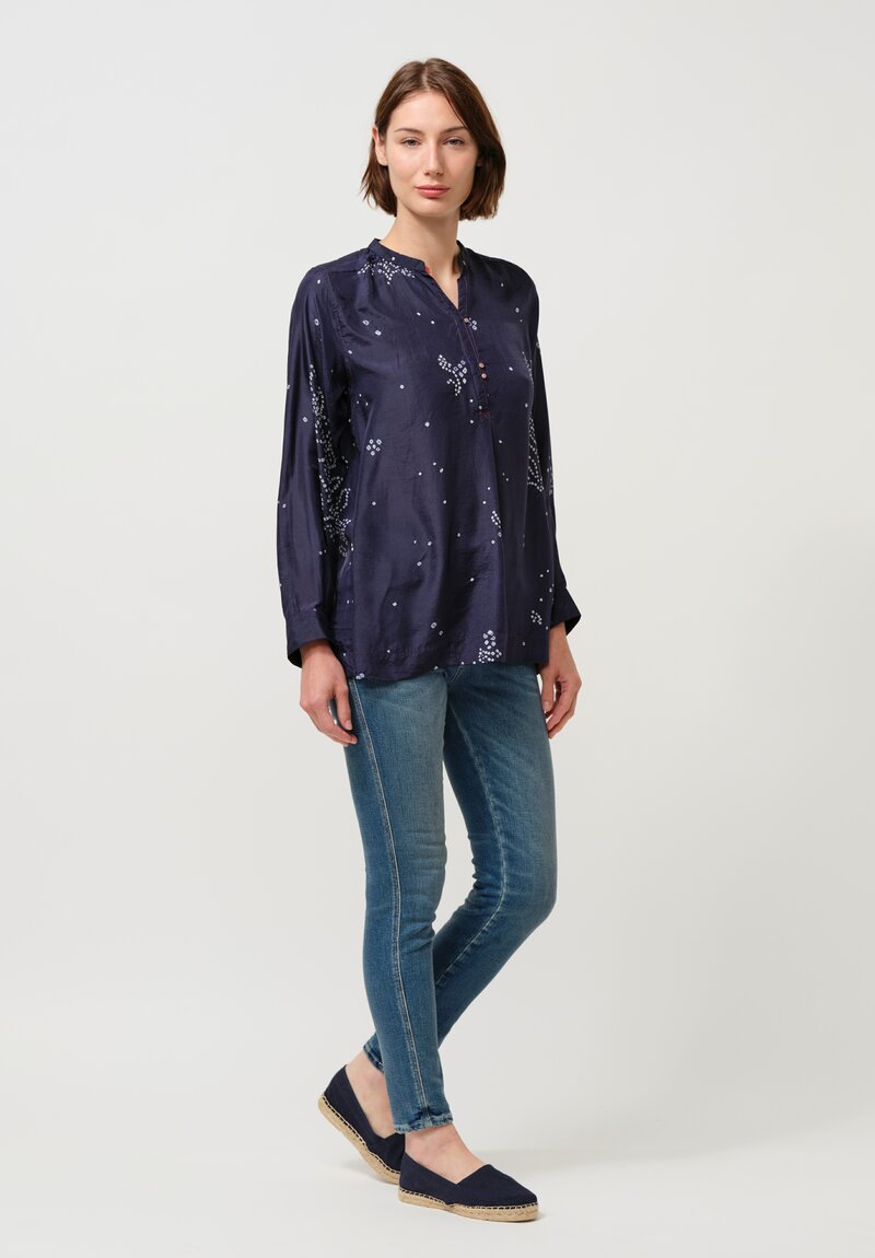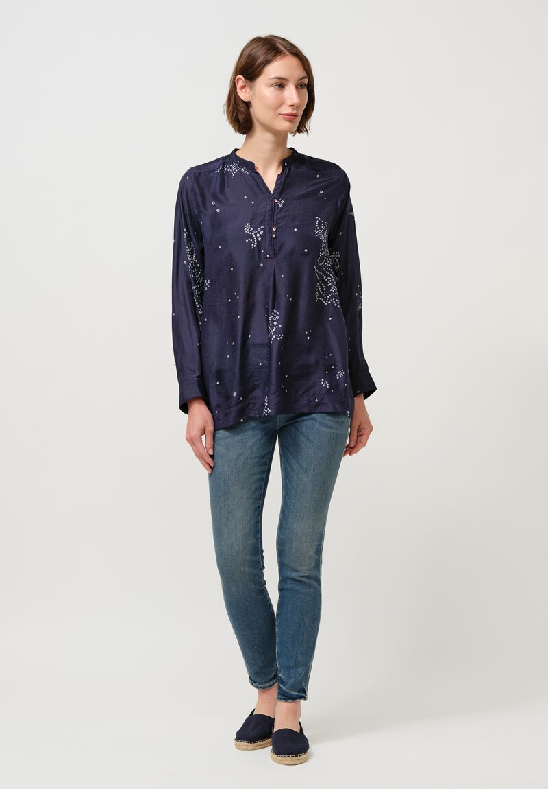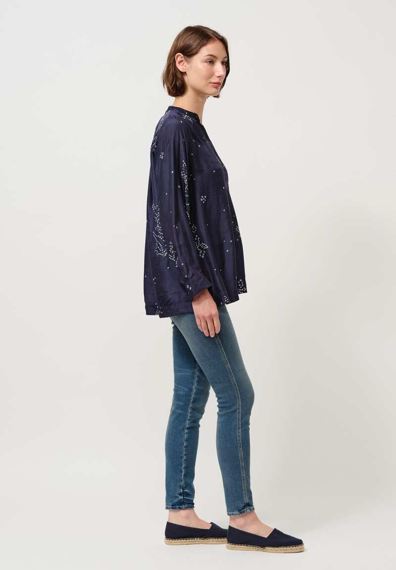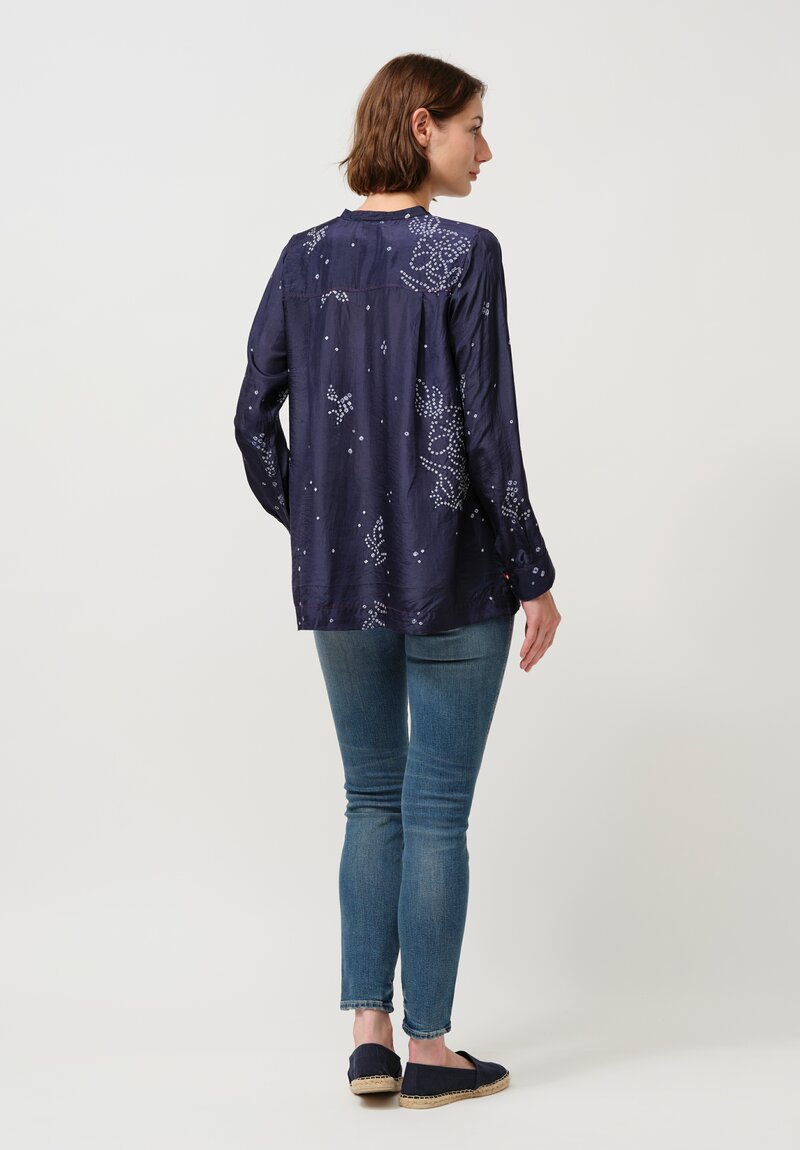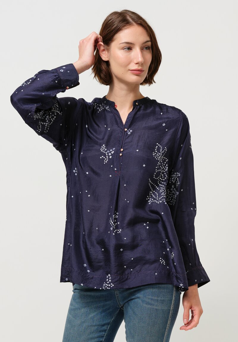 Using the highly specialized Bandhani technique, from the Sanskrit word Bandh meaning to tie, this piece was woven by hand by expert weavers in Gujarat and Kashmir. Prior to tying, the cloth is first washed to remove any impurities and then hand stenciled. Three tools are used by an artisan to tie a Bandhani pattern: Dehri, strong cotton thread to resist the area; Bhungali, a glass pipe which is used to hold and tie thread and Naklo, a thimble used to pluck a tiny area to tie.