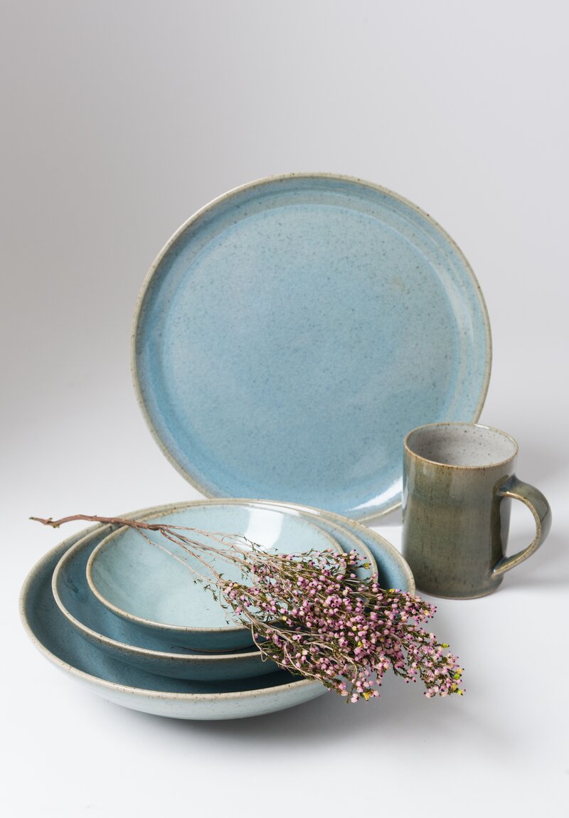 Award winning studio potters, James and Tilla Waters, are based in Carmarthenshire, Wales, where they hand-make thrown tableware, using both stoneware and porcelain clay bodies. For this line of ceramics, James & Tilla use the Chün glazing process to achieve a high-gloss, opalescent blue finish. Due to the carbonate materials used in the glazing process, bubbles are formed and trapped in the glaze, which creates refraction in ambient lighting. This refraction gives the Chun glaze its unique range of color from pale blue to pale blue-grey.