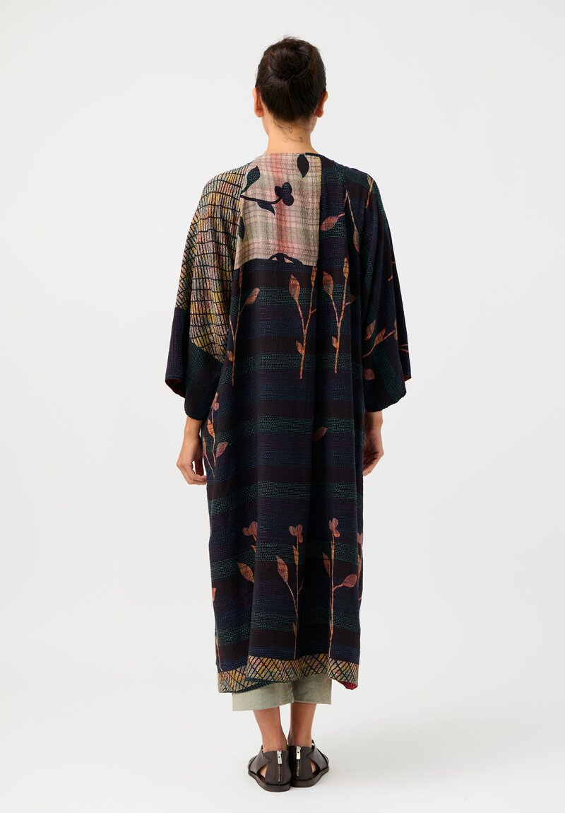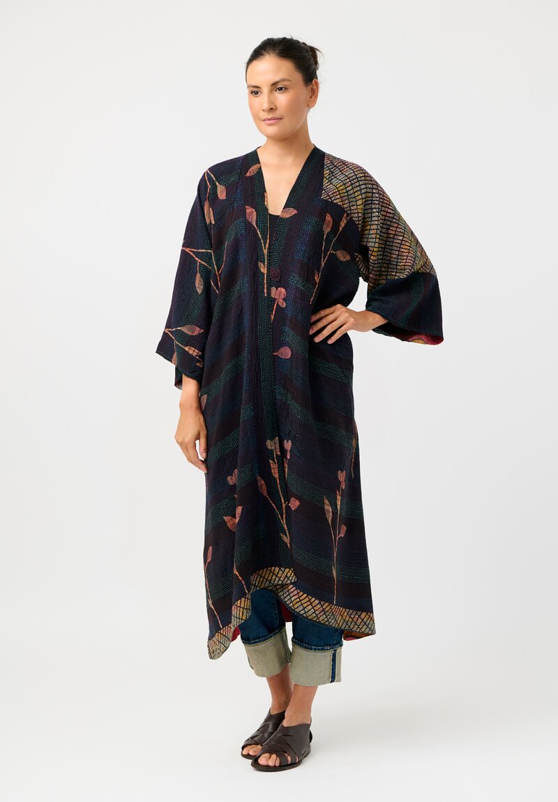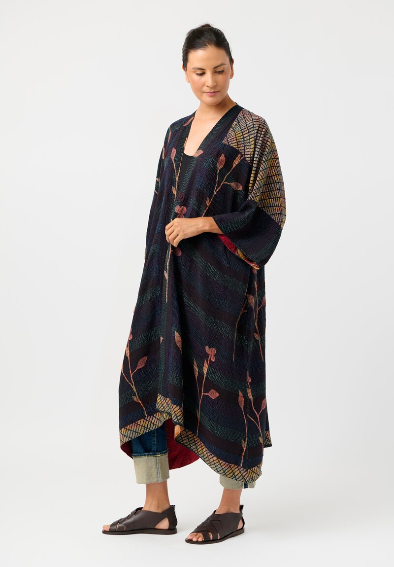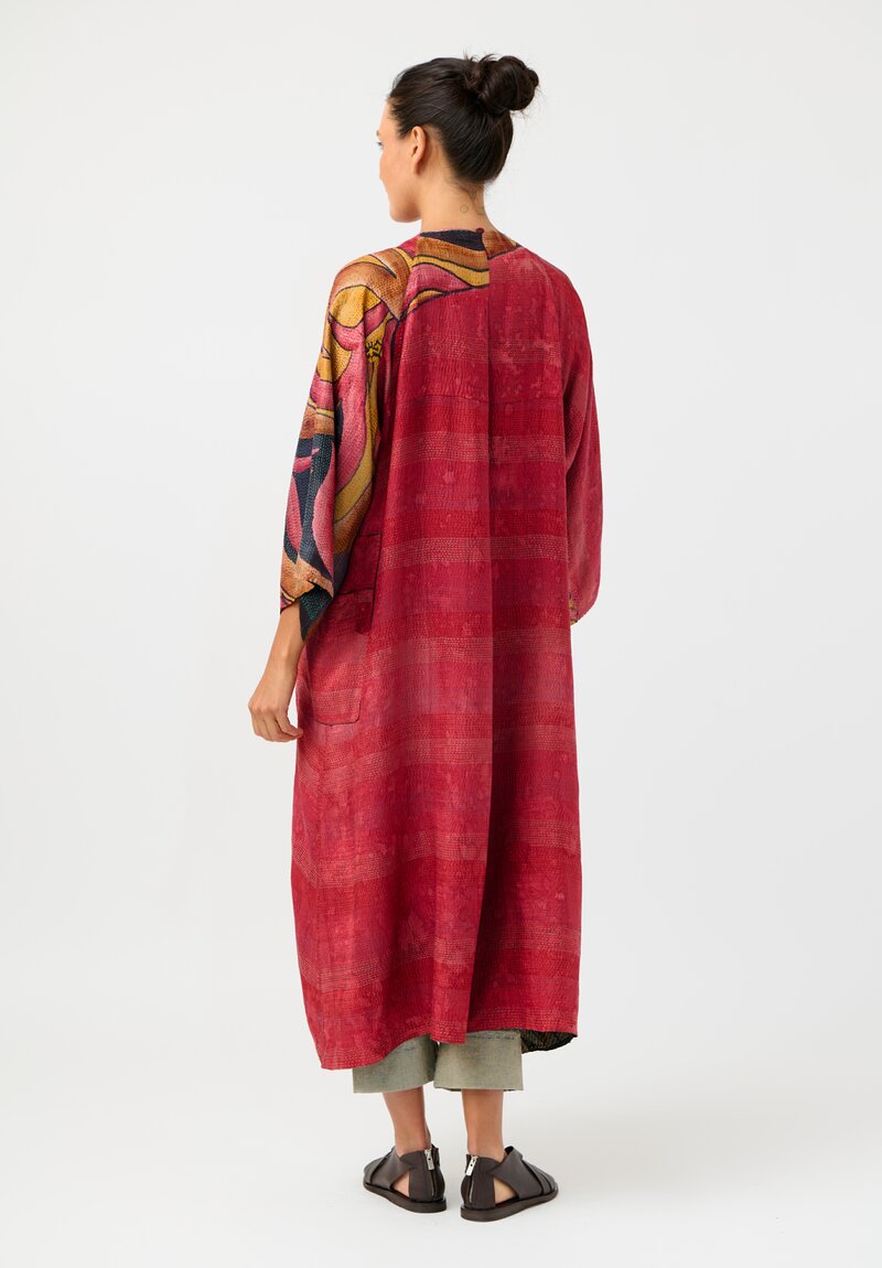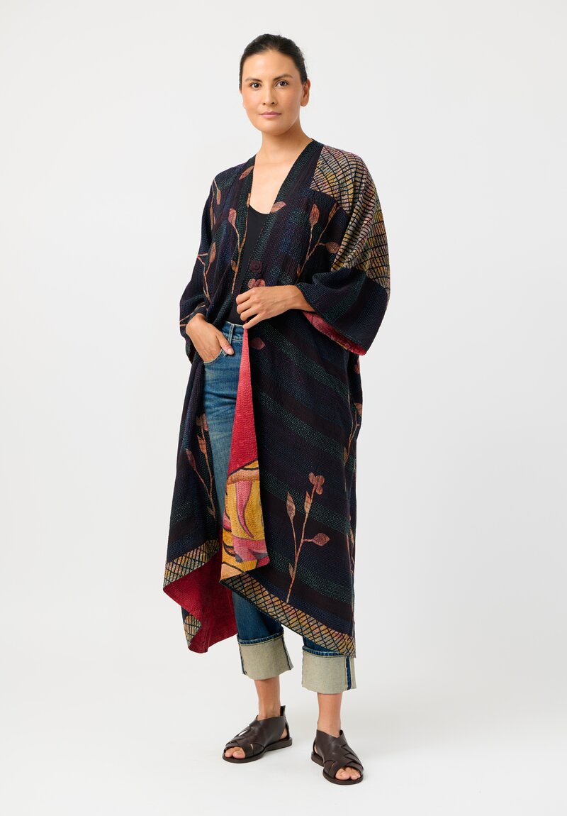 Mieko Mintz Vintage Silk Georgette Kantha Kimono Coat in Black, Red & Yellow