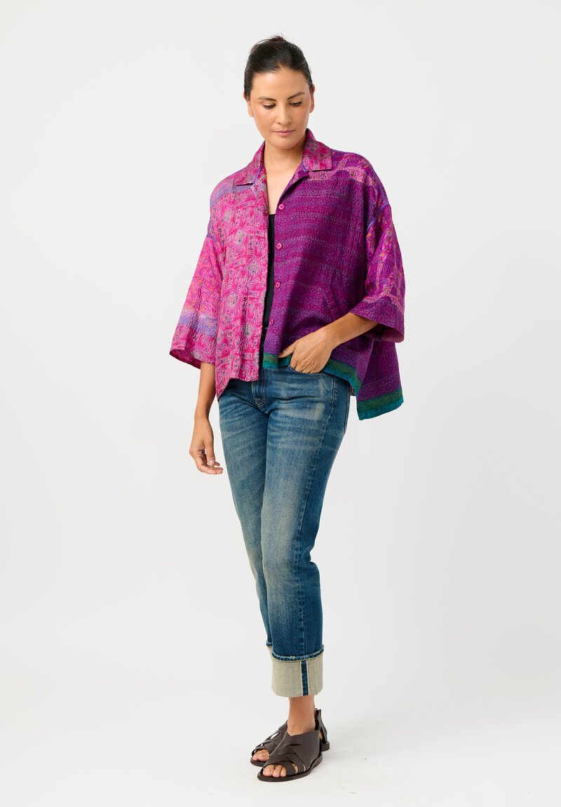 Vintage Silk Kantha Cropped Tent Shirt in Purple, Pink & Green