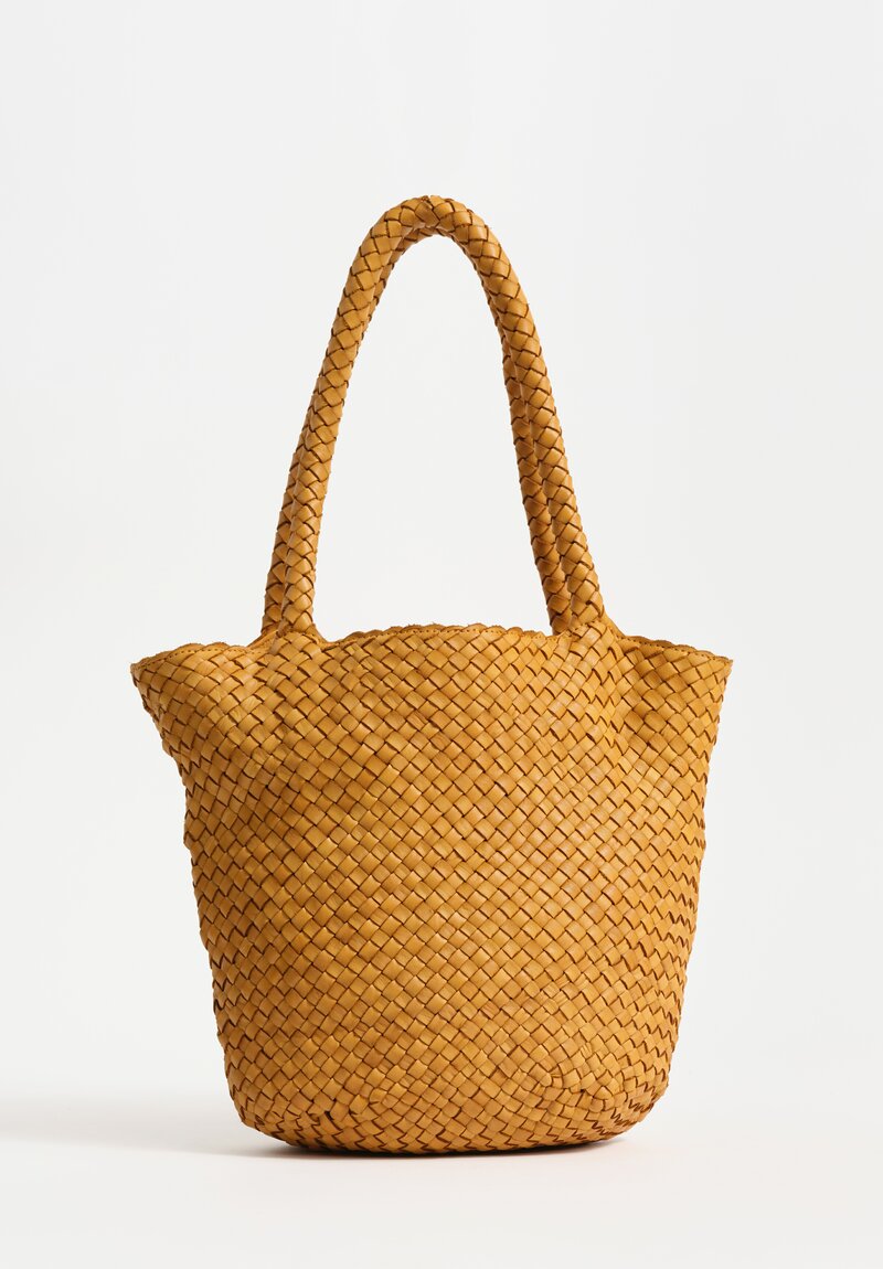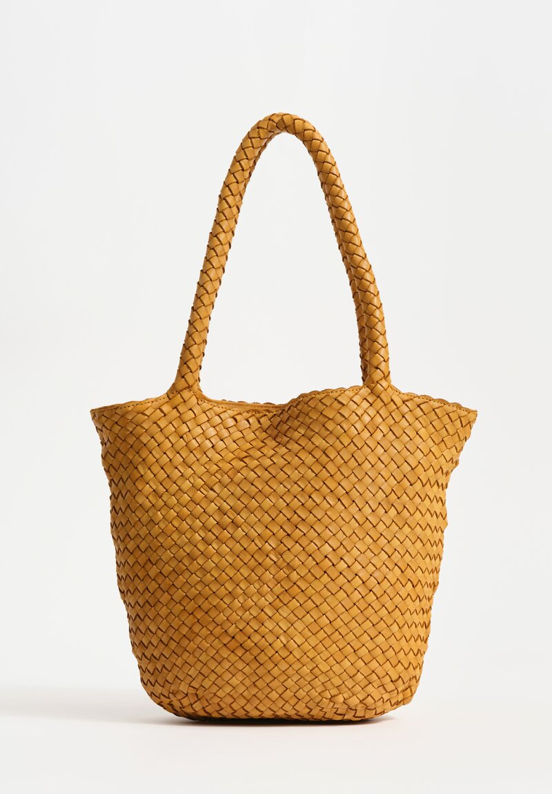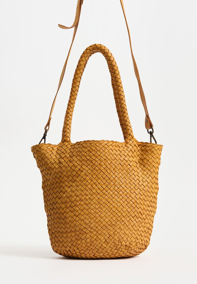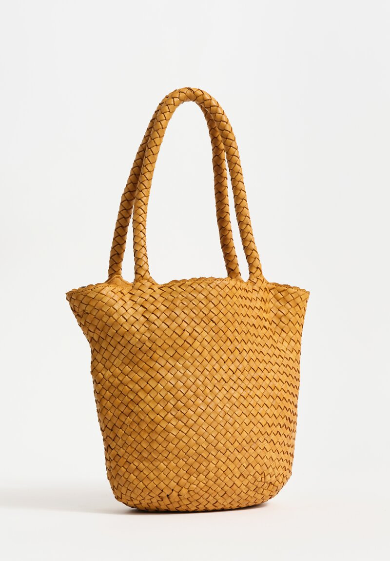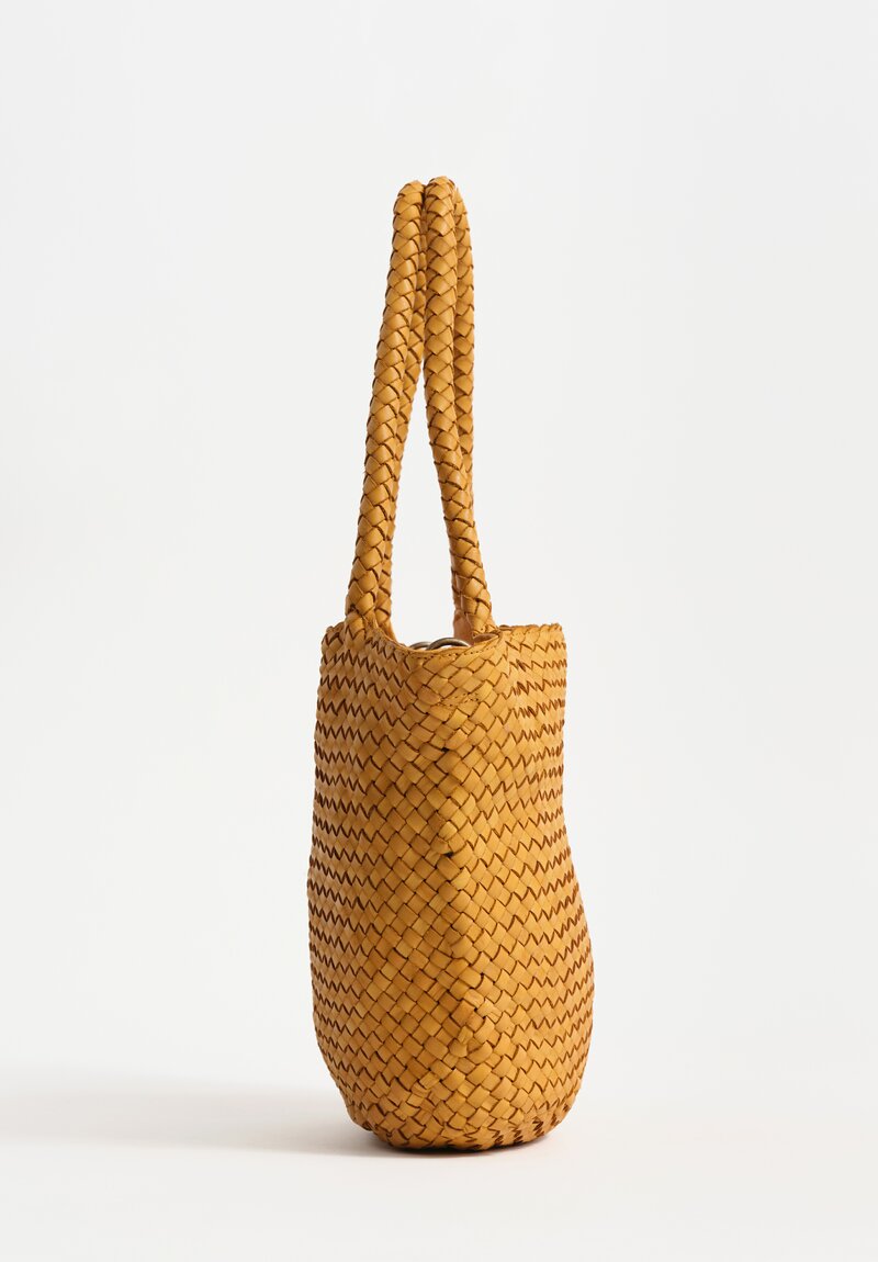 Woven Leather Small Trapezoid Shoulder Bag in Mustard Yellow