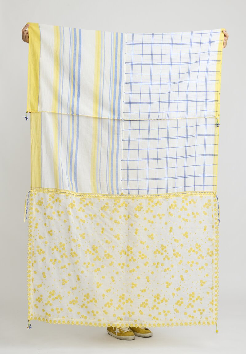 Péro Large Patchwork Embroidered Scarf in Ivory, Blue and Yellow