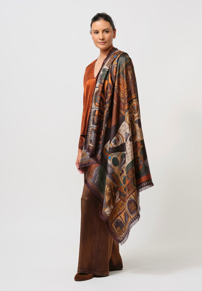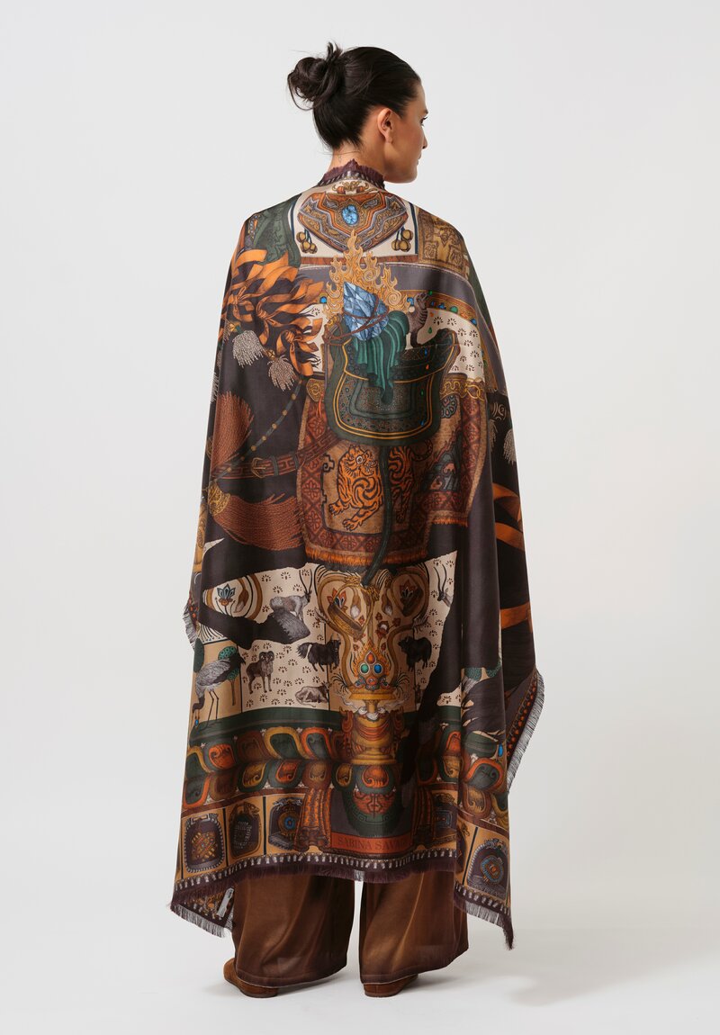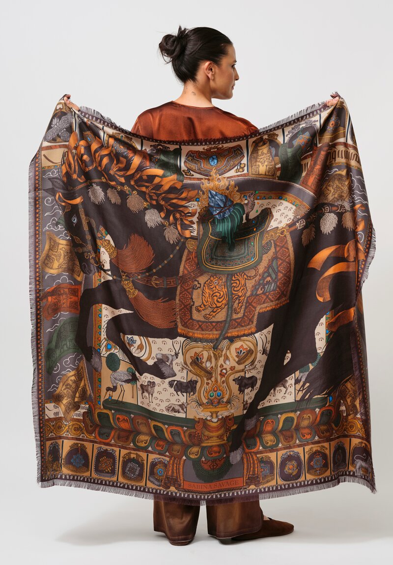 This design is inspired by ancient Tibetan thangkas and prayer flags. It features a galloping horse, representing the mythical Wind Horse from Tibetan mythology. The horse wears a traditional saddle with a Tibetan tiger rug as the saddle cloth, and dzi beads decorating the trappings. Detailed stirrups line the top and bottom of the design, each holding a small Ga’u box with a charm hidden inside for prosperity. On the horse’s back rides a small mongoose vomiting jewels, a sign of good luck, alongside the flaming, wish-fulfilling jewel, bringing peace, wealth and harmony. In each corner of the scarf are small carved charms representing the four animals of the cardinal directions, the garuda, the dragon, the tiger and the snow lion. Beneath the horse is a stylized representation of a bed of lotus petals, as often found in traditional thangkas. The prayer flags (also known as a wind horse) that arc around the design are another symbol of good fortune. The Tibetan script within the design reads ‘tashi delek’, an auspicious greeting meaning ‘good luck and good health’.