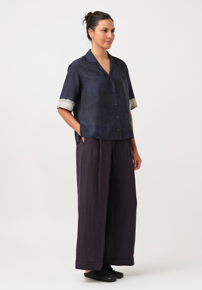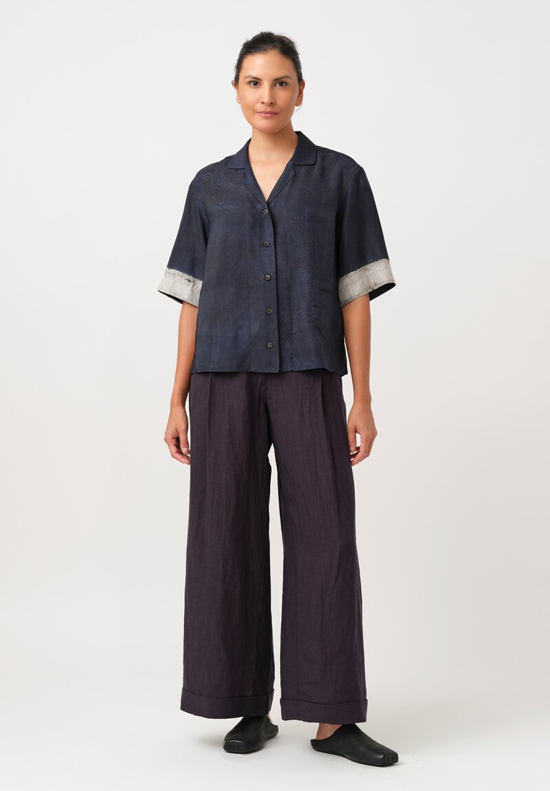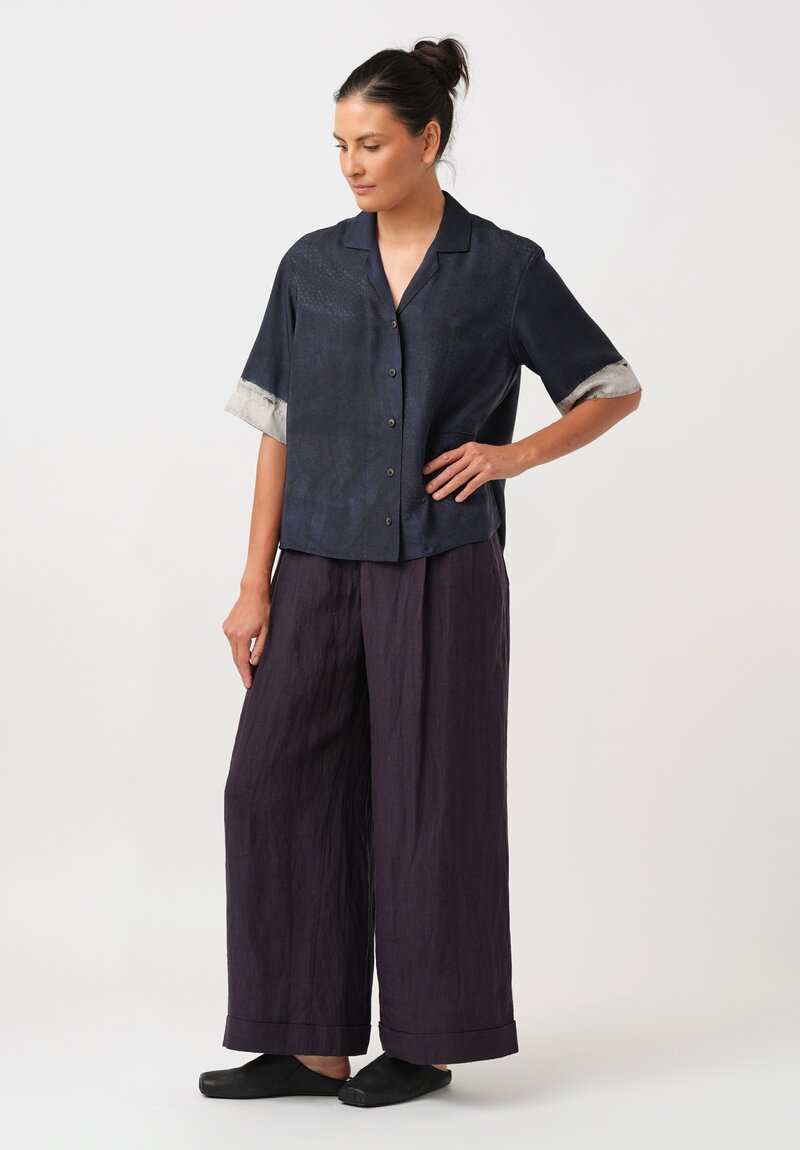 • Ziggy Chen Silk Button-Down Top in Navy Blue Digital Denim Print