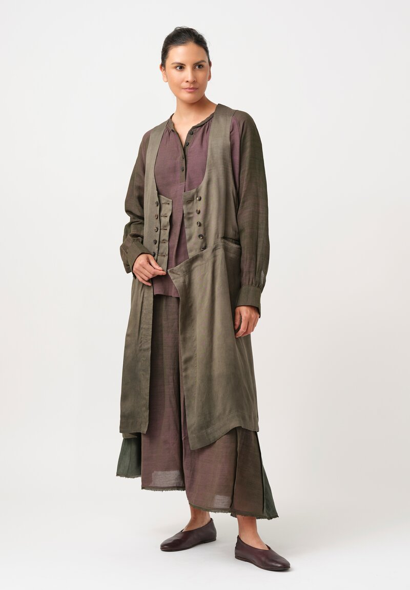 • Ziggy Chen Long Double-Breasted Tunic Wrap Vest in Olive Green