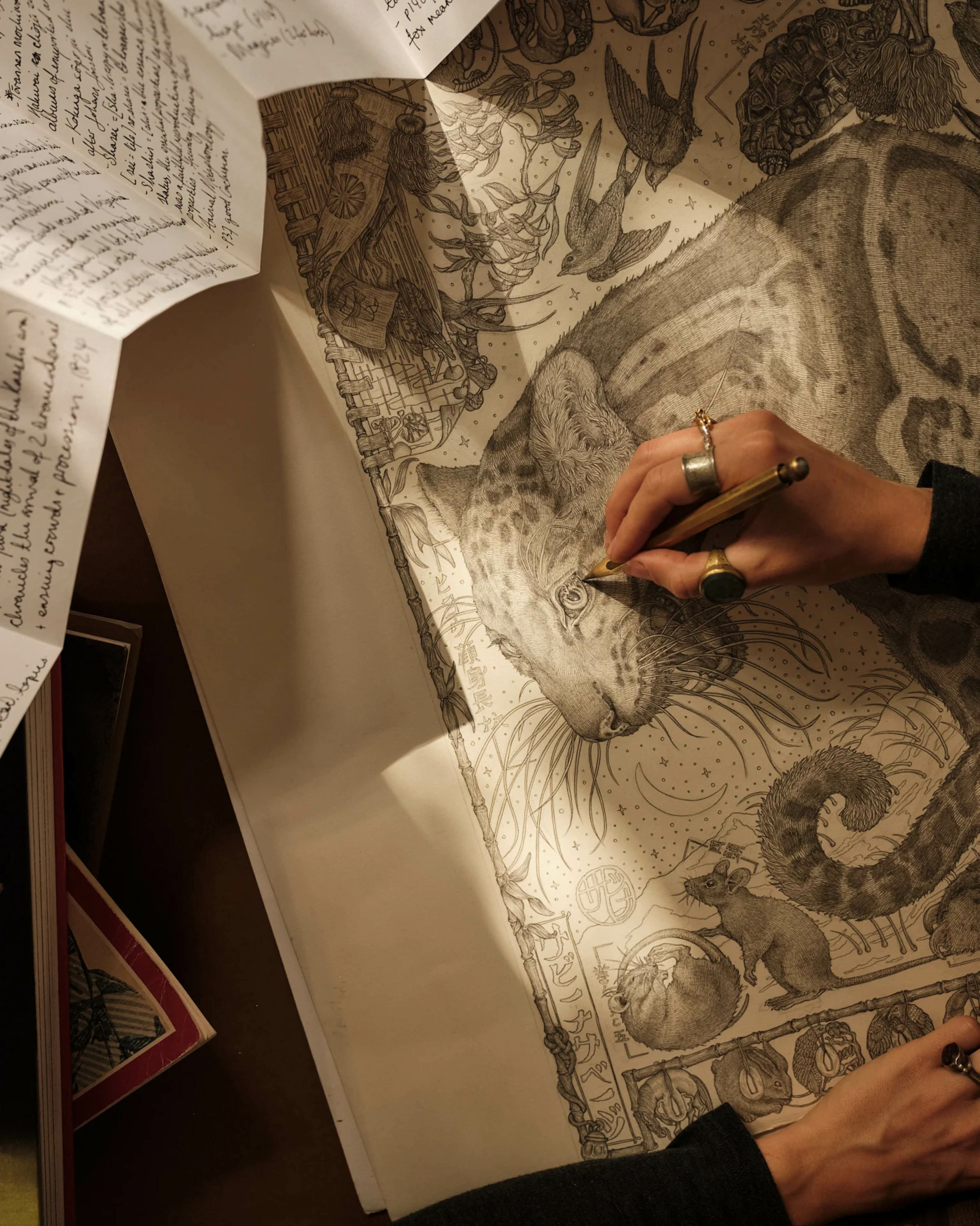 “This collection was inspired by the moralistic fables of the Panchatantra, specifically, ‘The Tiger, The Brahmin and The Jackal’, ‘The Bird Pair and The Sea’, and ‘How the Rabbits Fooled the Elephant’. The India Company School paintings were a great influence, particularly works by The Fraser Brothers and Ustad Mansur. Many details from the Padshahnama manuscript and the Gazi Scroll are also referenced, alongside exquisite Mughal miniatures and the Shah Jahan Album.” –Sabina Savage on the collection
