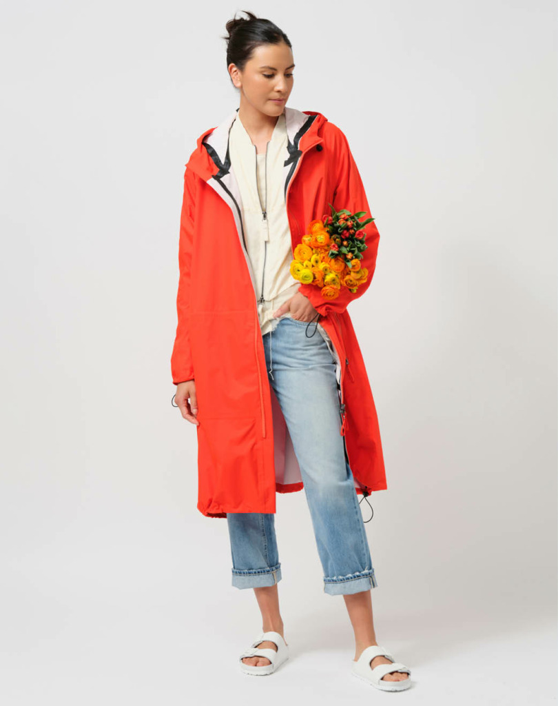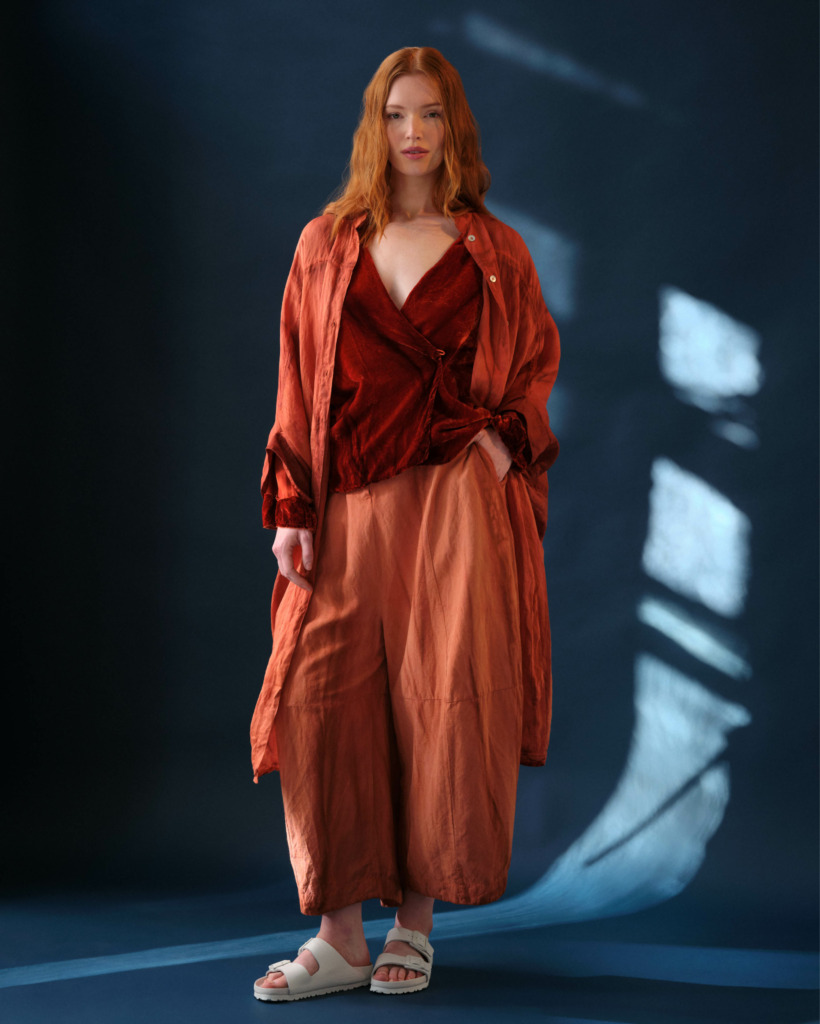 In her signature flowing silhouettes, Gilda explores the punchy intersection of rust and cerulean. Whether traveling, beaching or gardening, her hand-dyed textiles take the day in stride.