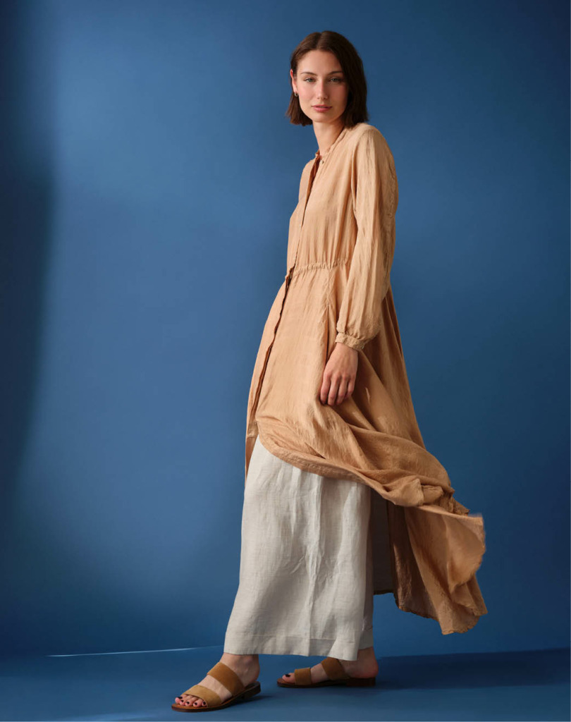 Founder and designer Junji Koike works from the Christian Peau studio in Kobe, Japan, a harbor city nestled between Osaka Bay and the Rokko mountain range. Junji crafts his garments with incredible skill and attention to subtle details, such as a silk skirt with a pair of ribbon suspenders that double as a drawstring. The dresses, jackets and tops in this collection are tailored with a breezy silhouette, making them ideal for warmer days.