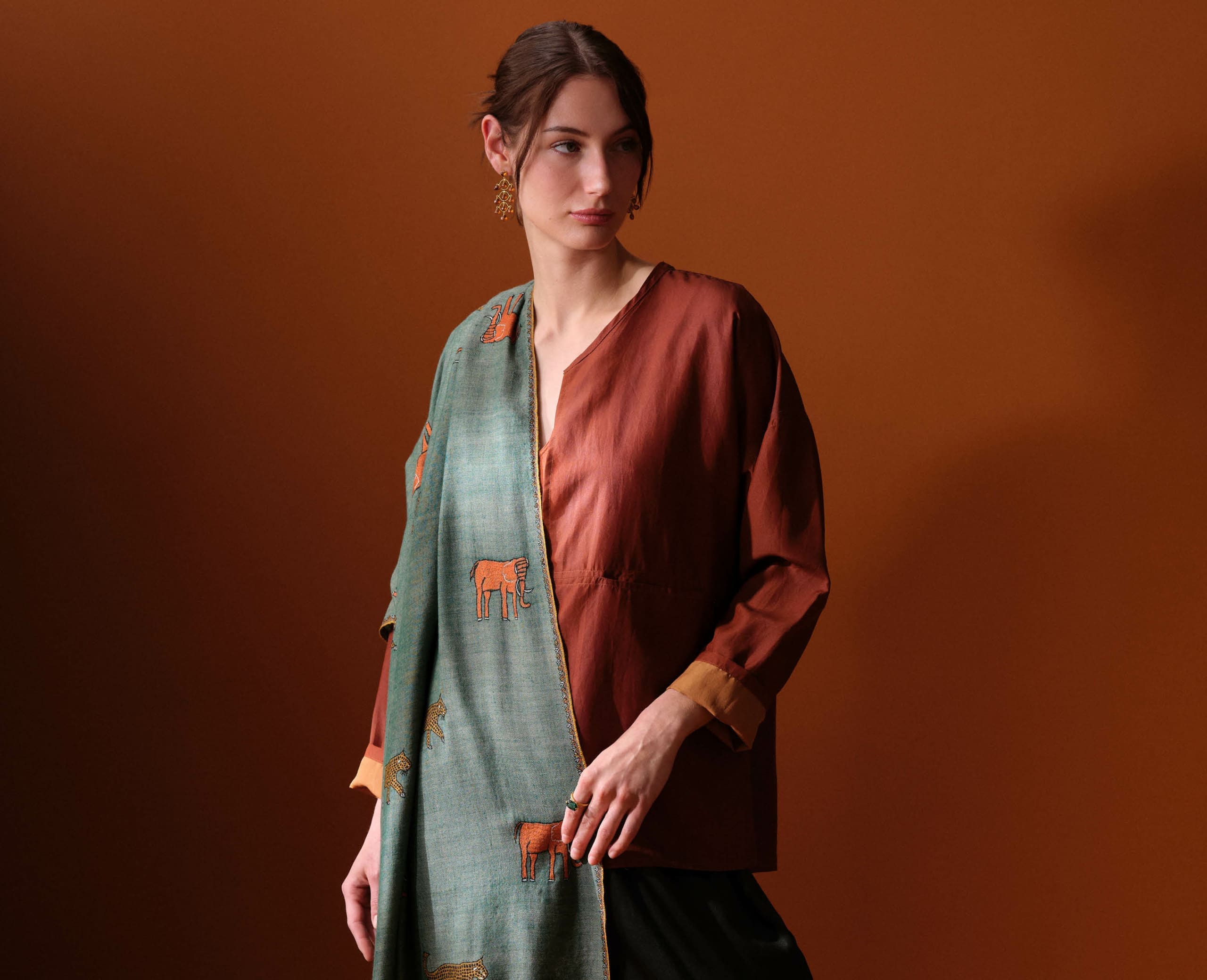 Yaser Shaw Cashmere Kashmiri Embroidered Scarf in Umber & Animal Motifs using Hand-Spun & Hand-Woven Pashmina Cashmere made in India