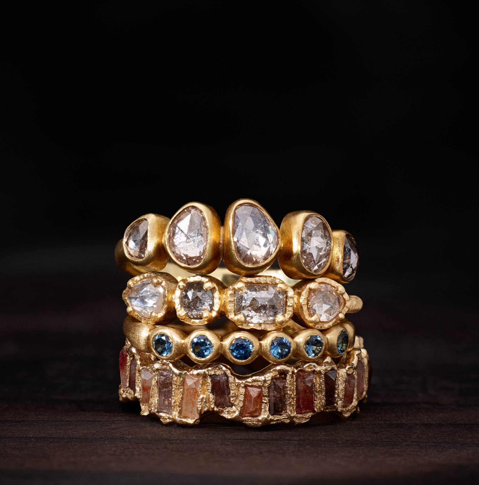 Ellis Mhairi Cameron 14K, Molten Red Baguette Diamond Eternity Scatter Ring Stack with alternative engagement rings