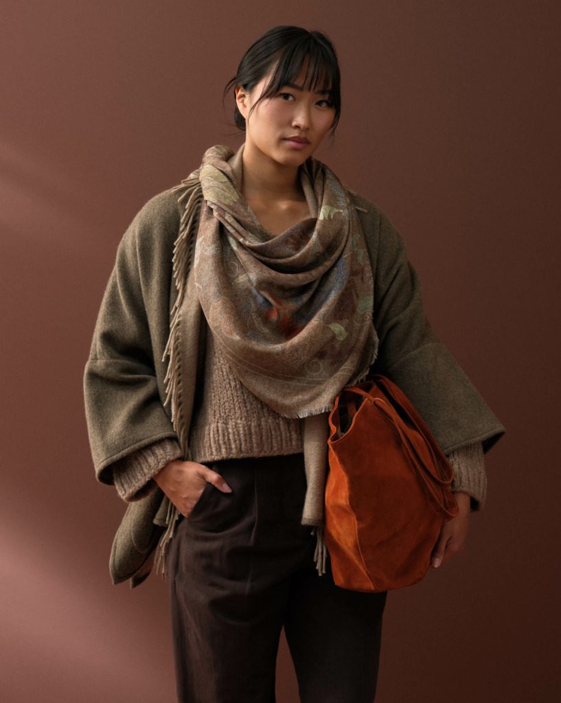 Alonpi’s commitment to cashmere is nothing short of devotion: this is a brand that has been dedicated to the art of softness for over 40 years. They prioritize the truest, softest cashmere found in the coats of Inner Mongolian goats. Their yarns, woven on site at their workshop in Biella, Italy, are woven into ponchos and wraps that are as lush as they are timeless.