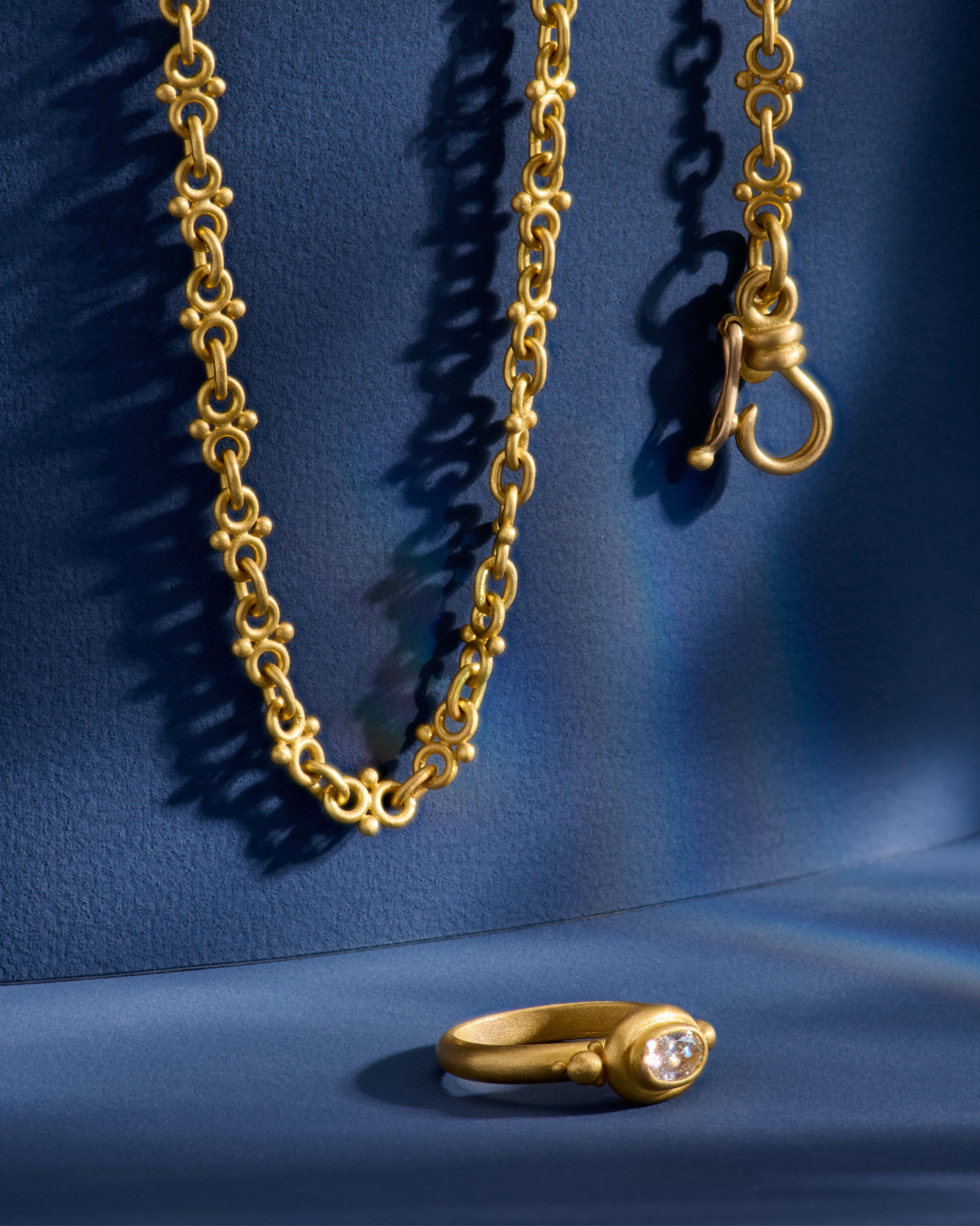 Each piece in Denise’s collection is shaped entirely by hand in her Santa Fe studio, using ancient techniques that connect centuries of craft to the modern wearer. Drawing and forming the metal, then fusing tiny granules in the time-honored art of granulation, her works possess an air of sculptural calm.