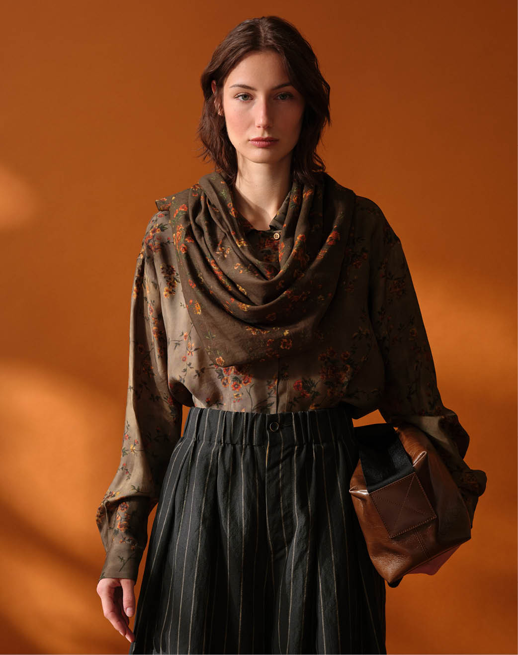 In the heady prints of Uma Wang’s Pre-Spring, we find not the romance of the garden, but the subtle drama. The delivery evokes the first buds peeking through damp earth, a signal of the world starting anew. Subtle textures in olive and brown dominate the collection in tones that Uma refers to as artichoke, cocoa and hazel.
