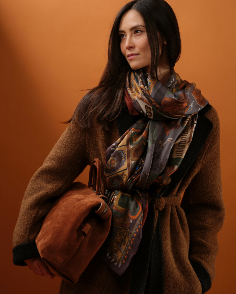 When paired with a coat in the same tonal family, Sabina Savage’s vibrant scarves elevate an outfit from everyday to extraordinary.